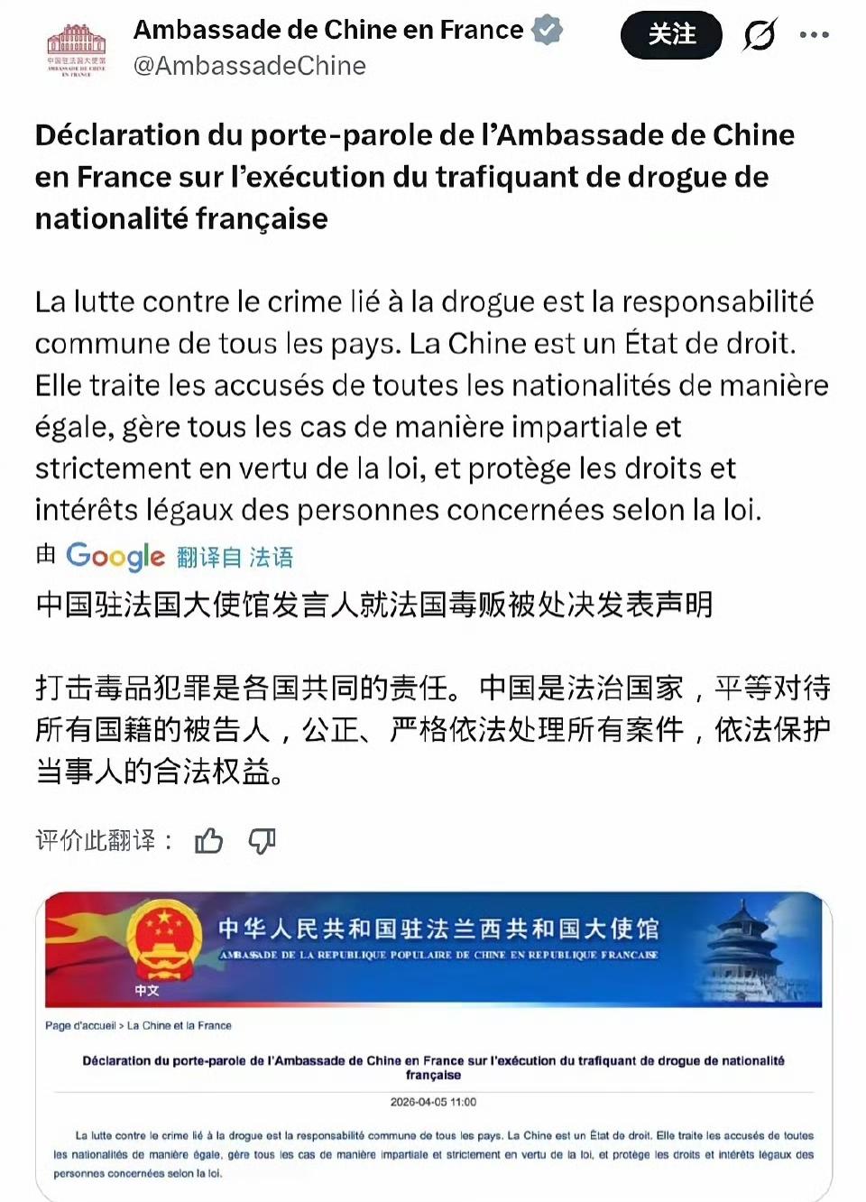 狠狠点赞!中国驻法国使馆声明:法籍毒枭陈森,已依法处决,法律面前没有国籍特权,更没有圣母滤镜。 中国驻法使馆这份声明,简直是给法国圣母们的 “最终通知”。没有多余铺垫,没有半句妥协,直接亮明结果:法籍毒枭陈森,已依法处决。 中国司法主权不容置喙: 在中国贩毒,触犯中国法律,就必须接受中国法律的严惩。 管你是哪国国籍,犯我国法,必受其罚。 这份声明干脆利落、立场强硬: 不解释、不妥协、不迁就,直接亮明依法处决的结果。 既守住了国门禁毒的底线,也狠狠维护了国家司法主权与尊严。 毒品祸国殃民,对毒枭严惩不贷,就是对人民最大的负责!