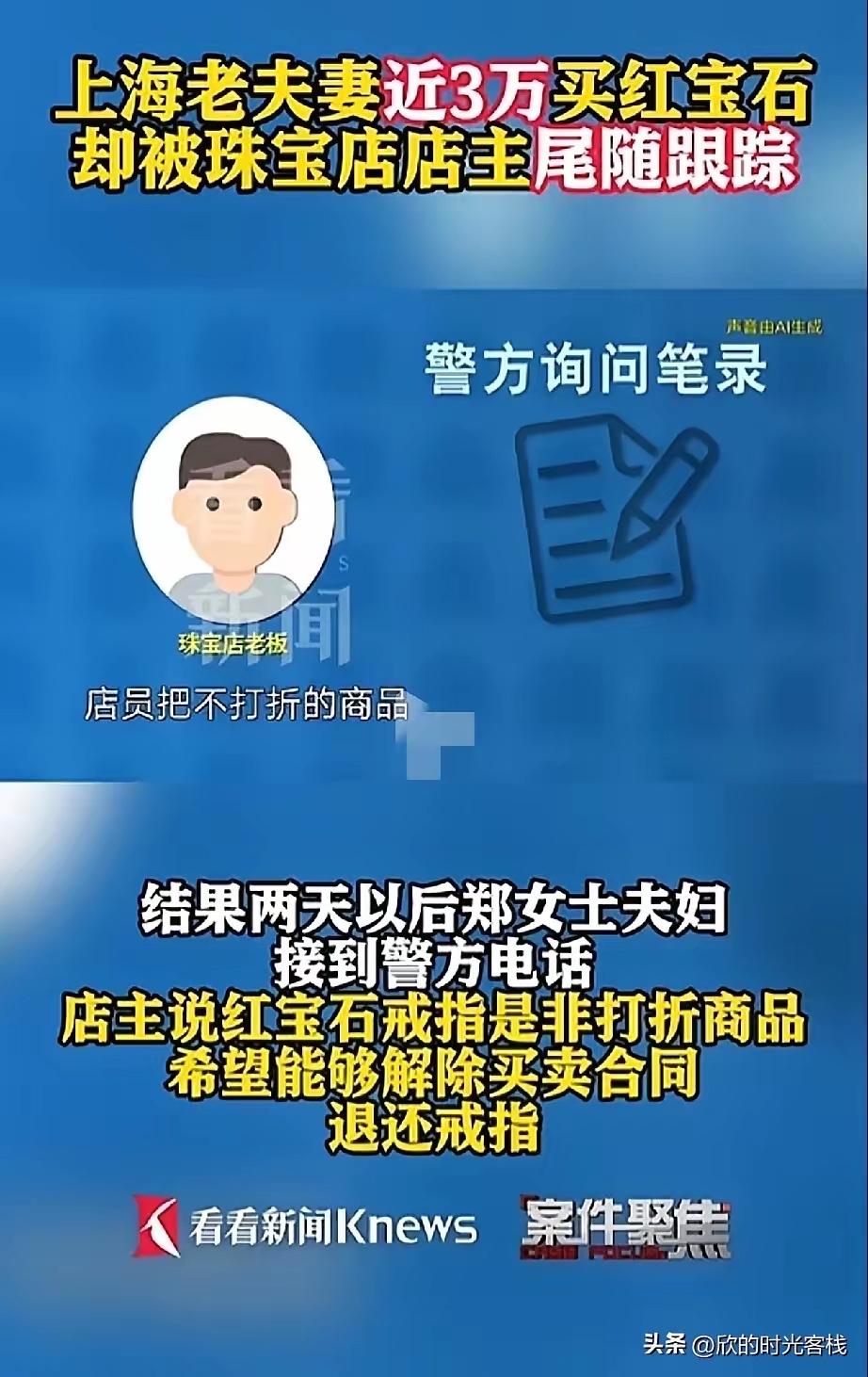 “玩不起!上海静安,一对年过七旬的老夫妻,在常去的珠宝店,花近3万买了枚红宝石戒指,本以为捡了个大漏,结果戒指到手才2小时,店家就来电话说标价错了,让他们退回去。更离谱的是,他们拒绝退货后,竟被店主一路跟踪到地铁站,还叫来两个人围堵他们,在未能如愿后,店家告上法庭,而法院判决,出乎店家的意料。” 郑女士夫妇七十多岁了,是一家珠宝店的老主顾,前前后后在这家店消费了几十万,算是VIP客户。2024年7月14号傍晚,老两口散步路过店铺,被店主热情地请了进去。店里挂着醒目的“全场1.5折”广告。店主拿出一枚3.08克拉的马达加斯加红宝石戒指,标价十九万七千五。按折扣算下来,只要两万九千六。老夫妻觉得这是店家给老客户的特别福利,没多想就转账买下了。店员开了收据,给了鉴定证书,戒指当场交付。买卖做成,双方都挺高兴。 谁能想到,才过了两个钟头,店主的电话就追来了。电话里说戒指“有质量问题”,让老夫妻第二天务必到店处理。那天晚上正好有欧洲杯决赛,老两口看了球,第二天又约了朋友去郊游,就没去店里。过了两天,警察的电话打来了。原来店家直接报了警,说店员搞错了,把不该打折的寄售商品低价卖了出去,要求解除合同,退回戒指。老夫妻觉得莫名其妙,东西买都买了,钱货两清,哪有这样反悔的? 几天后郑女士夫妇看完一个珠宝展,坐地铁7号线回家。刚出站,就发现珠宝店老板一路尾随跟了过来。对方先是好言相劝,希望他们把戒指退回来。遭到拒绝后,老板竟然挡在地铁口,不让他们乘车。争执一路闹到了车厢里。到站后老板还叫来了两个陌生男子,把两位老人围堵在站台的角落。老夫妻吓得够呛,赶紧报警。警察到场后,明确训诫了店家,告诉他们有纠纷应该走法律途径,不能这样跟踪恐吓消费者。 店老板看来是铁了心要拿回戒指,2024年10月,他以“重大误解”为由,一纸诉状把郑女士夫妇告上了法庭。店主在法庭上提交了寄售合同等证据,说这枚红宝石是帮一位“从美国回来的张姐”专门进的货,不属于打折商品。店员误操作导致低价卖出,给店里造成了十六万多的损失。他要求法院撤销买卖合同,判令老夫妻归还戒指。 静安区人民法院审理了这个案子,法官认为买卖发生时,双方对戒指的价格、折扣、最终成交金额都达成了明确的合意。交易已经完成,钱货两讫。店家提供的证据,并不能充分证明存在所谓的“重大误解”。红宝石这类珠宝没有国家统一定价,其价值很大程度上取决于买卖双方的认可和市场行情。既然交易已经达成,商家就应当遵守诚信原则。一审判决,老夫妻胜诉。店老板不服,上诉到上海市第二中级人民法院。2026年4月,二审法院作出终审判决:驳回上诉,维持原判。店老板彻底输了。 珠宝行业自古有个老规矩,叫“钱货两清、眼力为凭”。东西摆出来,价格标清楚,顾客看中了付钱拿走,交易就算完成。事后觉得卖亏了,那是你自己的经营风险,不能成为出尔反尔的理由。诚信是生意人的根本,更是市场秩序的基石。标价、促销的时候不谨慎,卖完了又反悔,甚至用跟踪围堵的下作手段,不仅输了官司,更输掉了信誉和口碑。老客户的心,恐怕也彻底寒了。 各位读者你们怎么看?欢迎在评论区讨论。