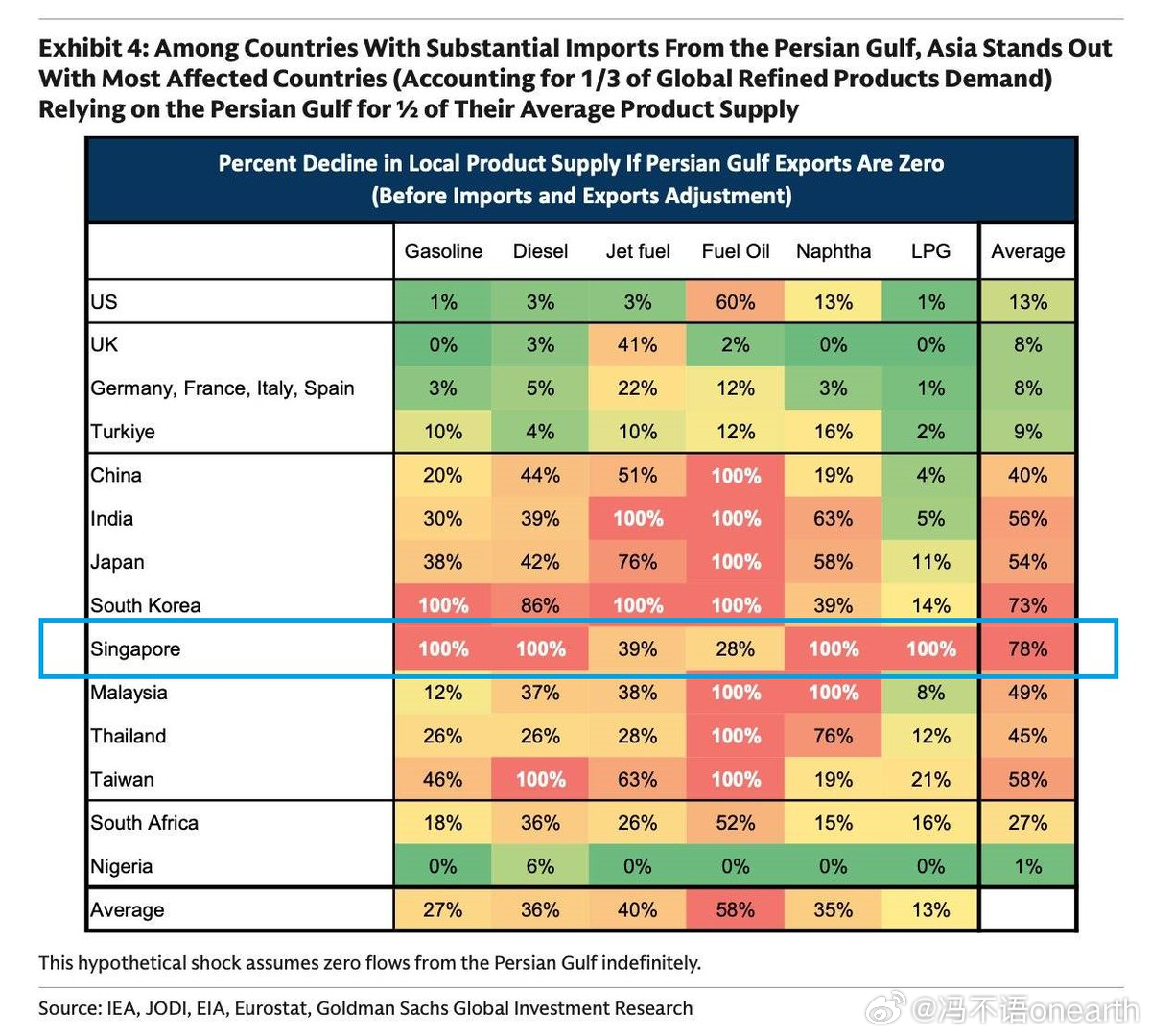 如果波斯湾出口为零,亚洲受影响最严重(占全球精炼产品需求的1/3),其平均产品供应的1/2 依赖波斯湾,意料之外的,新加坡的平均供应降幅最高,达到78%,它可能会耗尽汽油、柴油、LPG 和萘烷,并失去其三分之一的喷气燃料需求。