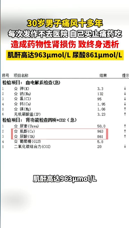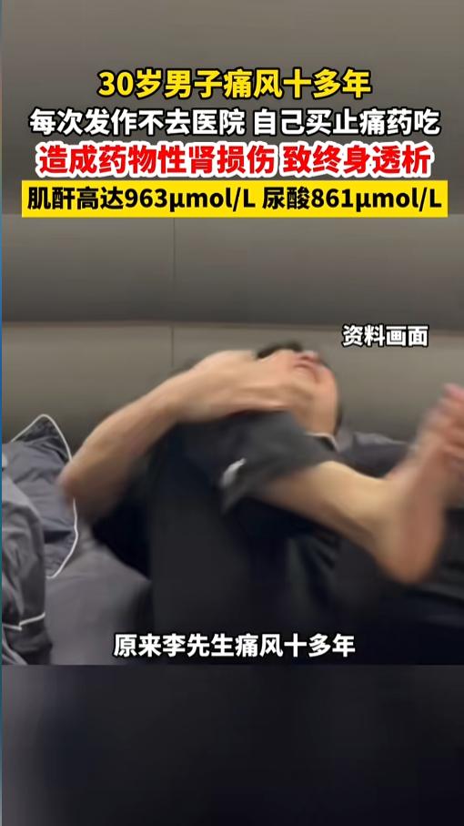 “悲剧还是发生了!”近日,广东东莞,一男子饱受痛风的折磨,已经十多年了,可是每次痛风发作,他都不去医院,而是自己买止疼药吃,不成想把自己身体吃坏了。最后双脚浮肿,被家里人用轮椅推去了医院!网友:止疼药不是万能的! 据媒体4月6日报道,李先生今年才30岁,但却是个痛风十年的老患者了,而且,每回他都不去医院,疼的厉害了,就自己买止疼药吃,反正自己能忍受住就行。 最近一段时间,李先生的症状变得更严重了,除了疼之外,还出现了胸闷气短,尿里也出现了泡沫,最后双脚也变得浮肿,根本走不了路,坐在轮椅上被家人推去了医院。 检查结果一出,李先生和家人都呆住了。肾功能检查显示,李先生的尿酸含量比正常人最高水平高了一倍还多,肌酐水平更是高了8倍多,都是严重超标,最后被确诊为药物性肾损伤导致的终末期肾病,只能一辈子靠透析生活了。 肾脏具有极强的代偿能力,初期有些损伤根本就没有症状,甚至肾功能损伤一半了,病人都可能感受不出来。所以,肾脏的病,一旦真觉得不舒服了,往往就已经发展到了晚期。 网友看后表示,是药三分毒,一伤肝,二伤肾,尤其是那些见效特别快的西药,千万不要随便买来吃。身体不舒服还是要及早看医生,吃药也要严格遵医嘱,可不能想吃就吃,太过随意! 信息来源:《30岁男子痛风十多年,每次发作不去医院,自己买止痛药吃,造成药物性肾损伤,致终身透析。肌酐高达963μmol/L,尿酸861μmol/L》杭州网