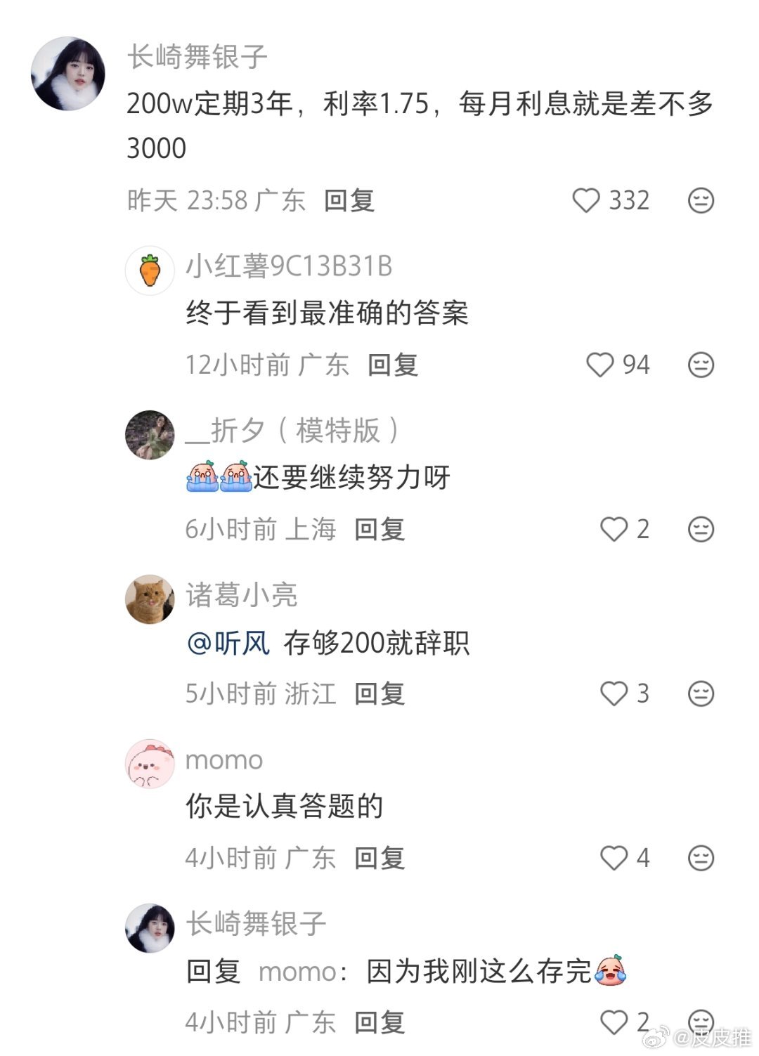存款200万,一个月利息3000元,相当于一份保底工资。网友:存够200万就辞职
