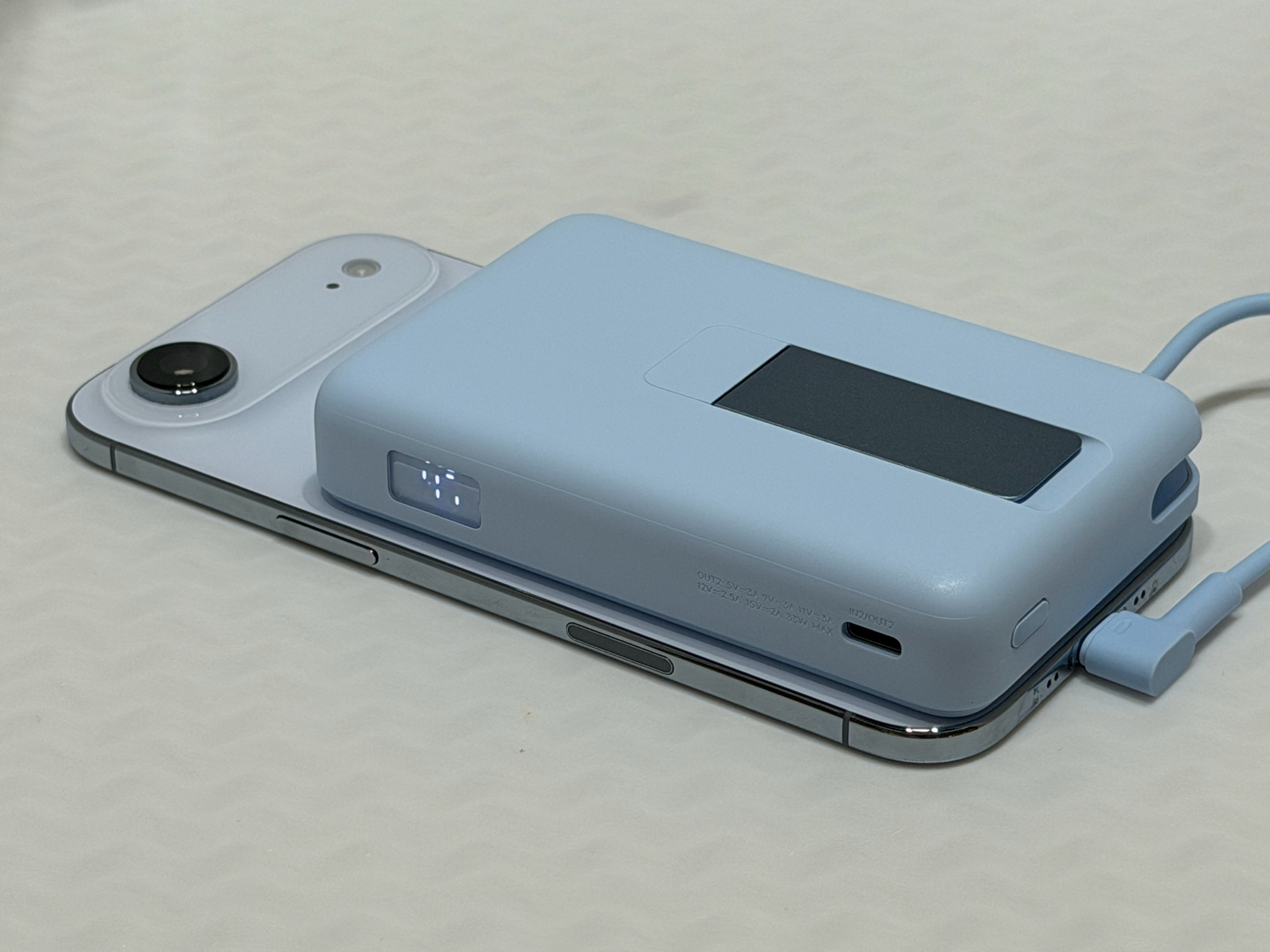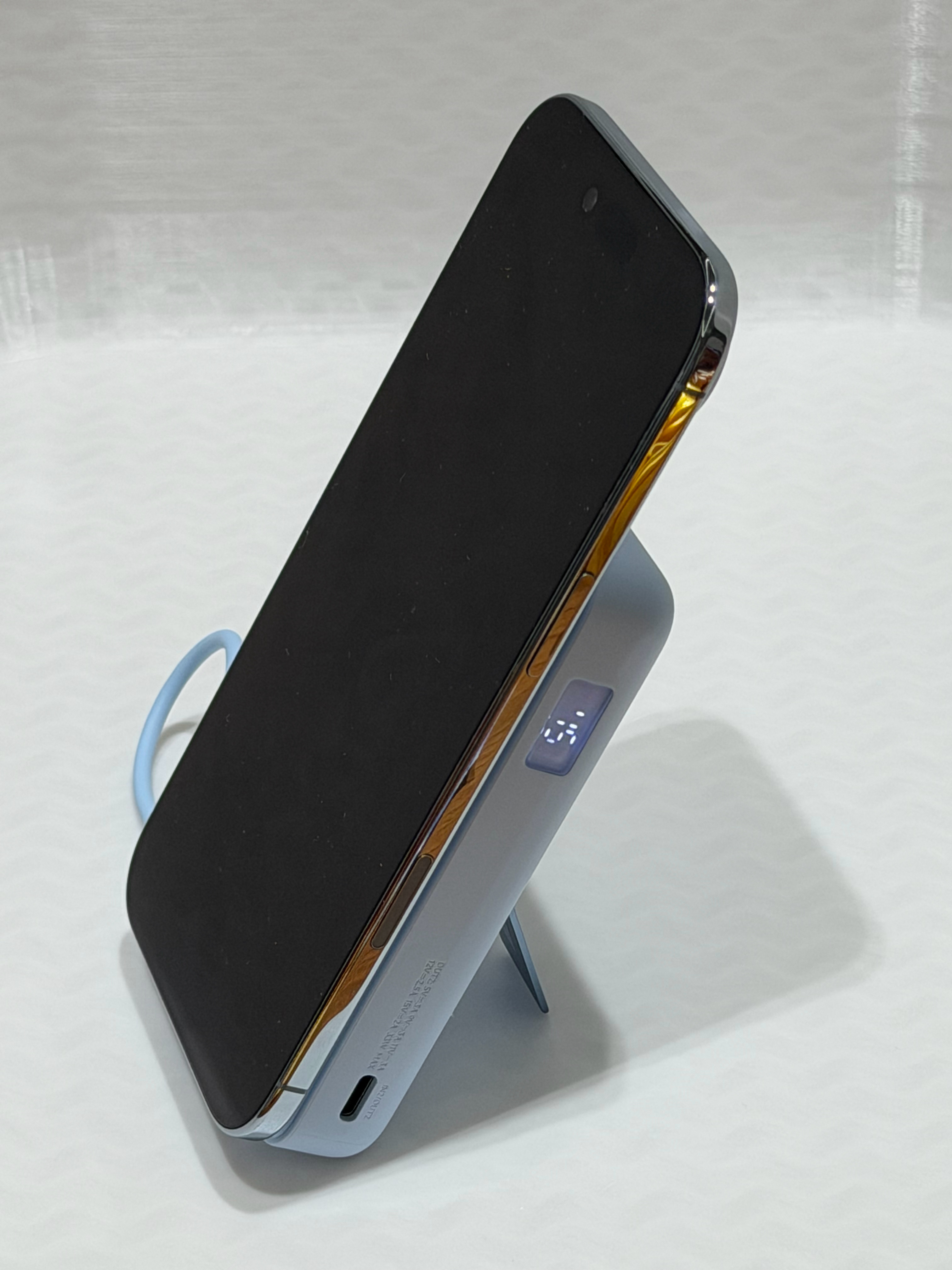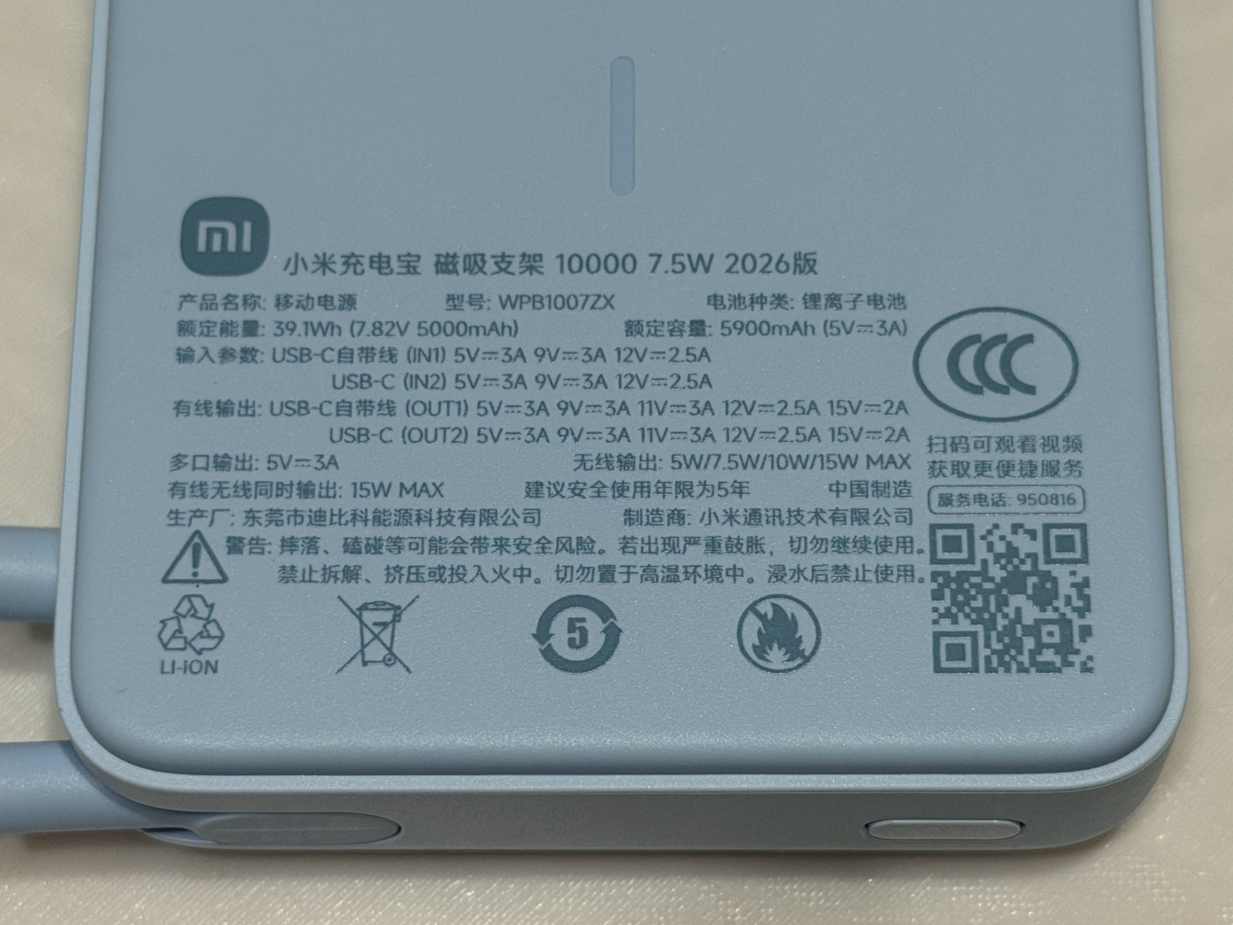 磁吸是支持MagSafe;支架就是集成了物理支架,阻尼力较高,可以把手机以各种角度立起来,用着很方便;10000,就是通常理解中的10000mAh容量,物理电芯能量39.1Wh。实际标称容量是按照国标5V3A大电流测出来的放电容量,是5900mAh;7.5W是MagSafe支持的iPhone无线充功率,把这个写在型号里有点保守了,因为安卓手机能支持15W无线功率,有线能输出30W功率;2026版没啥可说的,就是最新标准的新款。