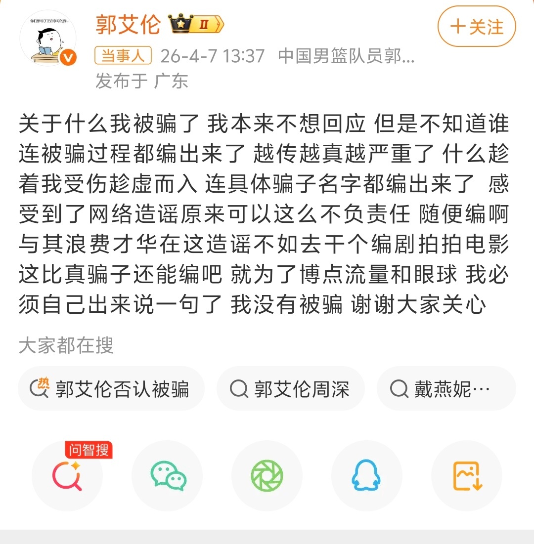 郭艾伦否认被骗等等?这也能反转?那就是没有被诈骗……还是被骗了,但不是熟人干的