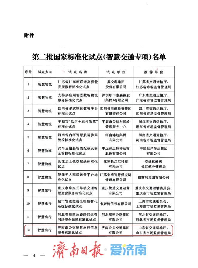 为充分发挥标准在智慧交通领域的引领作用,交通运输部、市场监管总局联合开展第二批国家标准化试点(智慧交通专项),经试点征集、申报推荐、专家审查和社会公示,确定了25个试点项目,包括智慧物流试点项目8项、智慧出行项目6项、新型基础设施11项。全国仅两家公交企业入选试点名单。济南公交集团承担的“济南市公交智慧出行信息服务标准化试点”脱颖而出、成功入选。