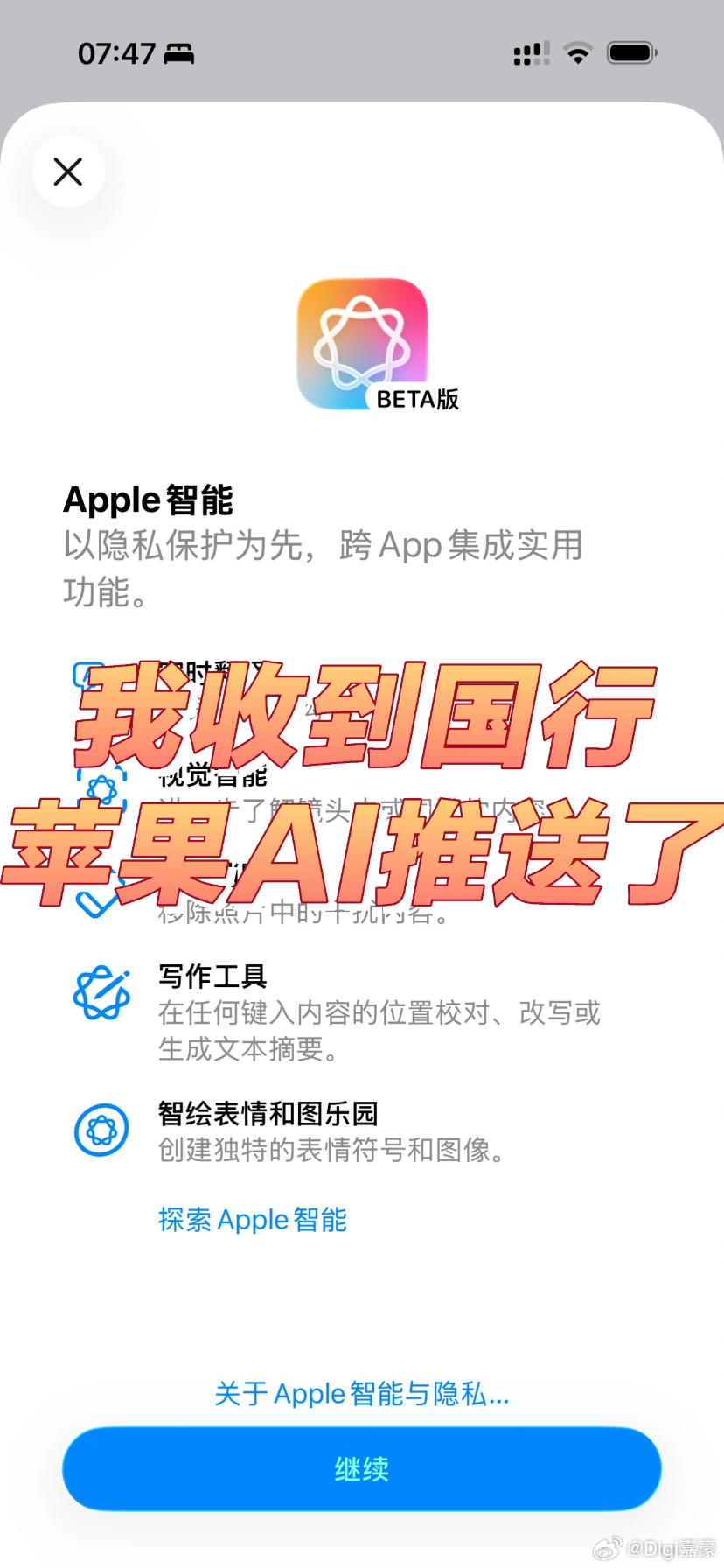 国行版苹果AI 我收到了苹果AI国行的推送,你们收到了吗?据说是小批量推送的 bug,目前已经撤回了,原因是还没有通过监管。