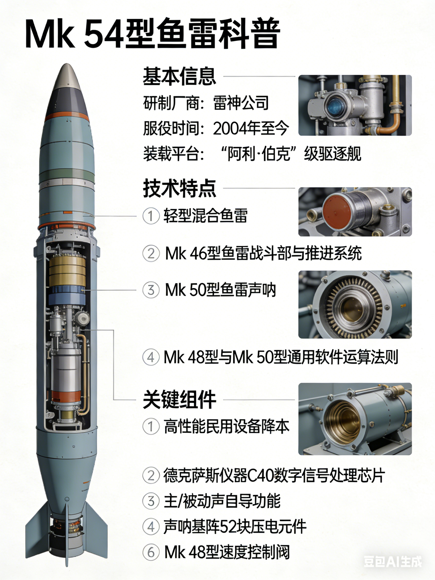 武器类型:轻型鱼雷研制厂商:雷神公司服役时间:2004年至今装载平台:“阿利·伯克”级驱逐舰