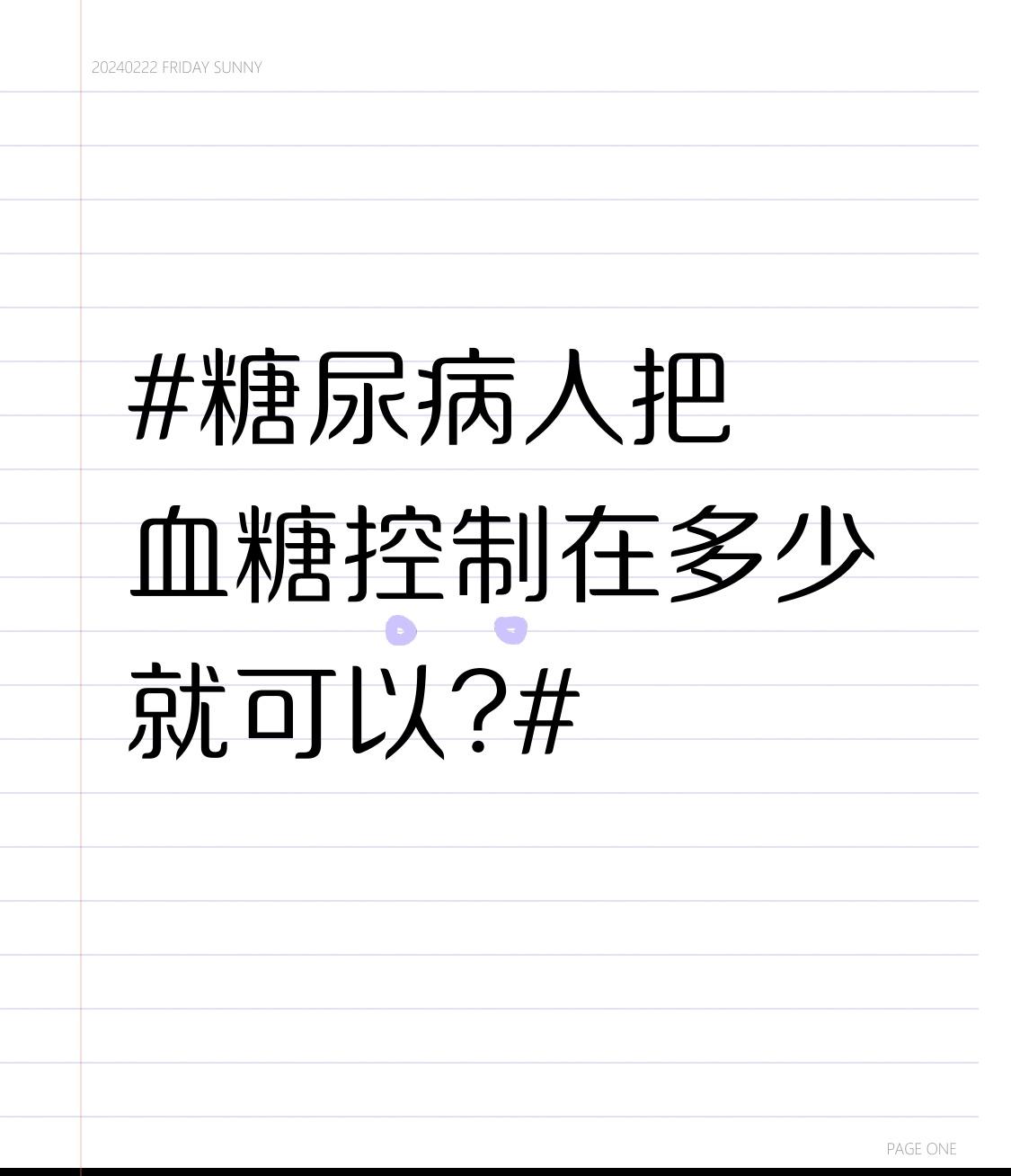 糖尿病人把血糖控制在多少就可以? 糖尿病人把血糖控制在多少合适,其实因人而异。一般来说,空腹血糖控制在 4.4~7.0mmol/L 比较理想,非空腹血糖要控制在 10.0mmol/L 以下。 不过,年龄不同、身体状况不同,要求也有差别。年轻、身体好且无并发症的糖友,标准可以更严格些;而老年糖友或有严重并发症的,血糖控制标准可适当放宽,以免发生低血糖。就像我一朋友,年轻力壮,一直把空腹血糖控制在 5 左右,身体状态就很不错。所以,糖友们要根据自身情况,和医生一起制定合理的血糖控制目标。 /