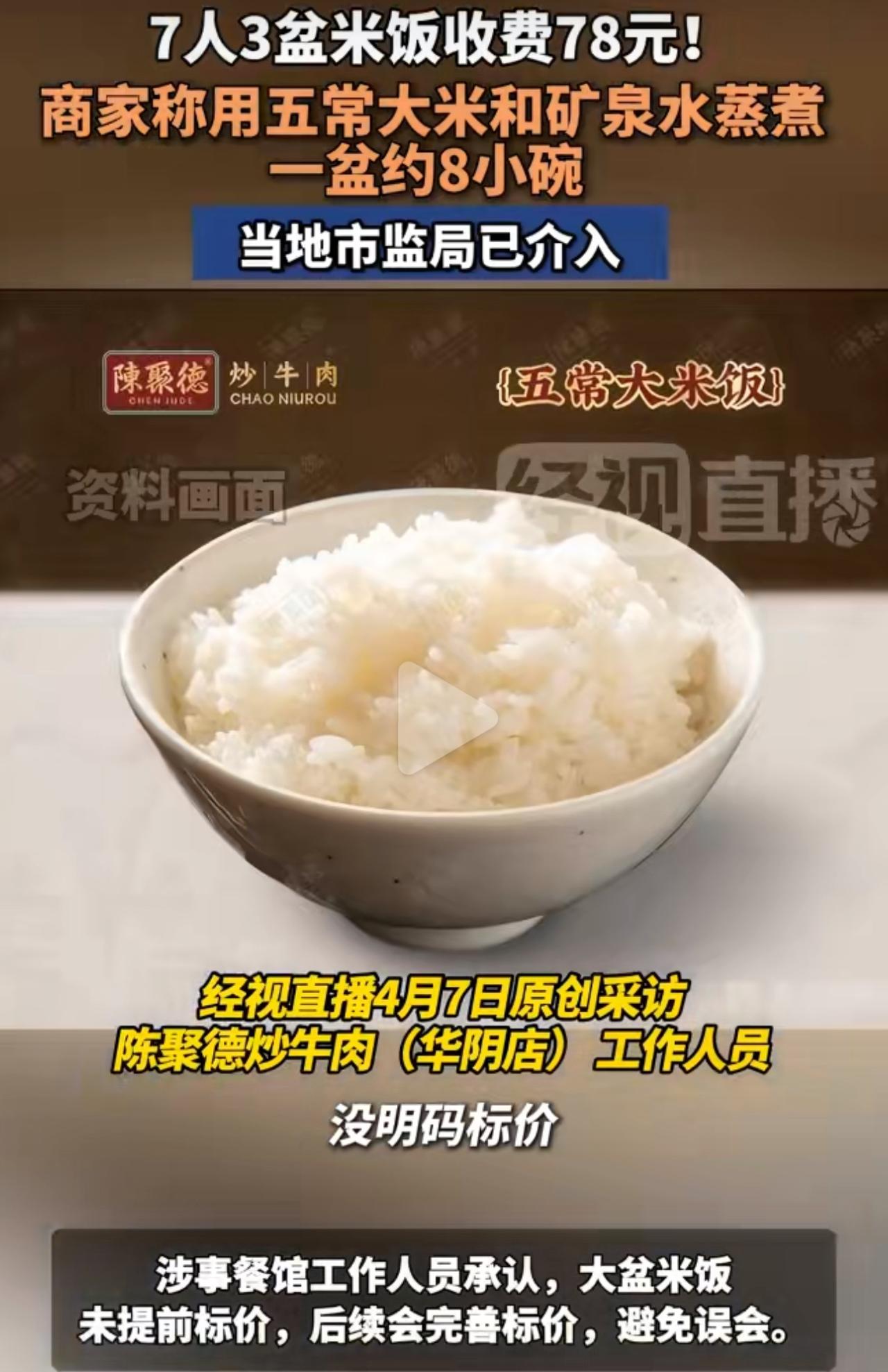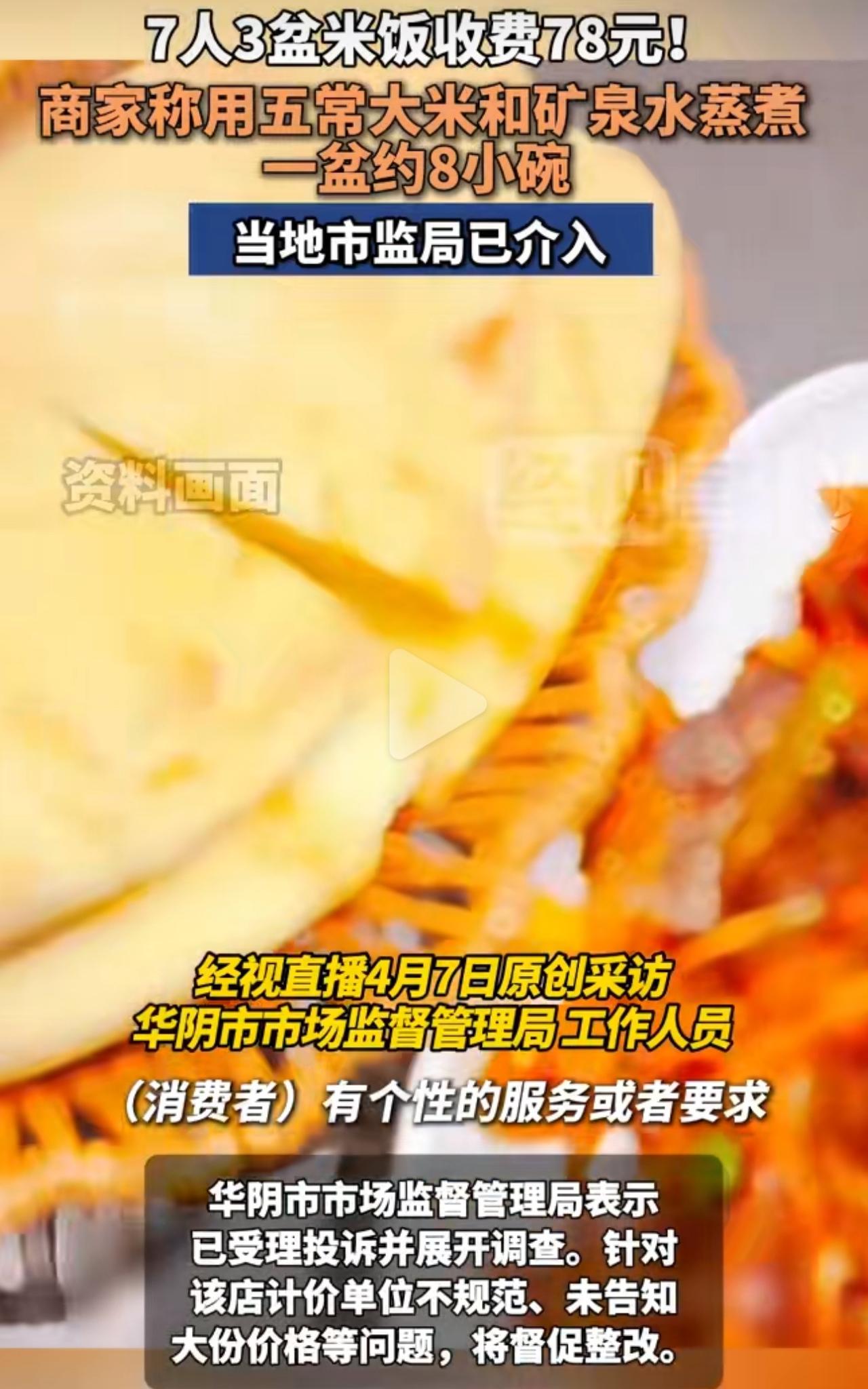 7个游客爬完山,肚子饿得不行,去了山脚下一家餐馆。人多饭量大,就跟店家要3盆大份米饭。菜单上只写着小份米饭3元,大份价格完全没标,店家也没提前说一声,游客们还以为米饭能有多贵,压根没多问。 结果结账那一刻,人都傻了。账单总共439元,光3盆米饭就收了78块,一盆26元。更离谱的是,结算单上写着“1克”“1盅”这种乱七八糟的单位,看着就像在故意混淆。 游客当场质疑,餐馆却说大盆用的是五常大米,还加矿泉水蒸,一盆顶八小碗,所以贵。他们还解释单位乱是系统的问题,不是按克收费。可这都不能掩盖一个事实:大份米饭没标价,也没提前告知,本来就是商家的问题。 监管部门已经介入调查,说这家店违反了明码标价的规定,违规最高能罚5000元。 景区物价合理范围内大家能接受,但不能借着游客累、信息不对称,就玩这种模糊定价。出门在外,不管点什么大份、特色,一定要先问价,不然真的容易吃哑巴亏。旅游景区餐厅 7人华山下点3盆米饭被收78元 景区餐厅