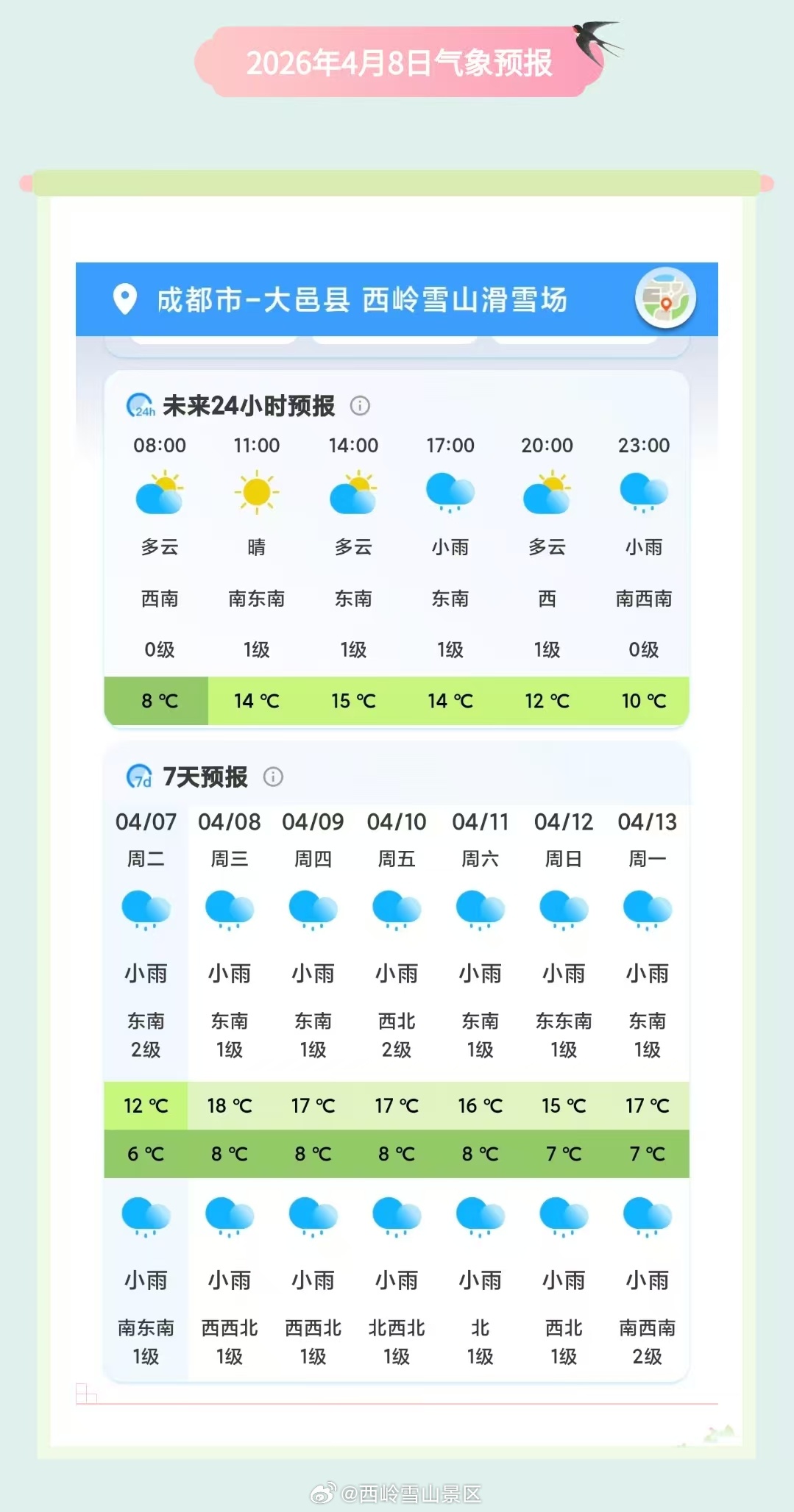 西岭雪山4月8日(周三)气象预报#西岭雪山#
