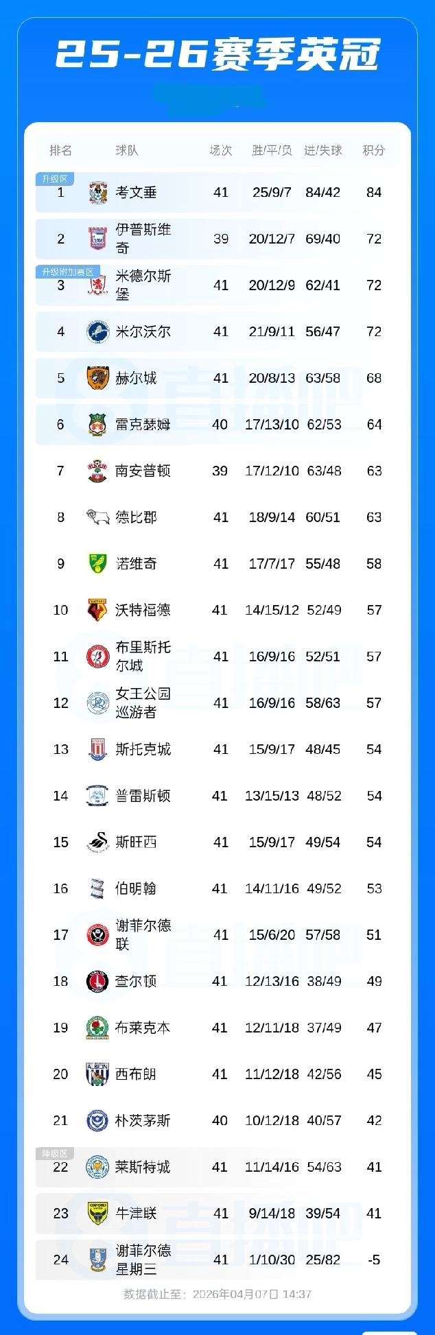 英冠积分榜:考文垂积84分以12分优势领跑 米堡升级急刹车 近5轮不胜积72分排第3 04月07日,英冠第41轮 米德尔斯堡2-2战平斯旺西 最新积分榜上:米德尔斯堡近5轮不胜,积72分排第3,与第4的米尔沃尔同分,而同积72分排在第2的伊普斯维奇少赛2场,考文垂积积84分以12分优势领跑