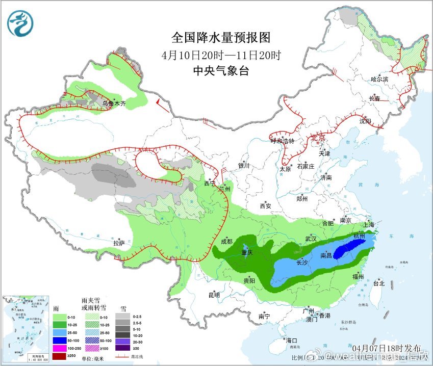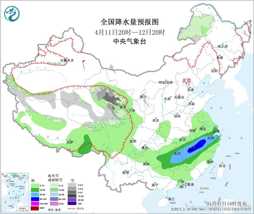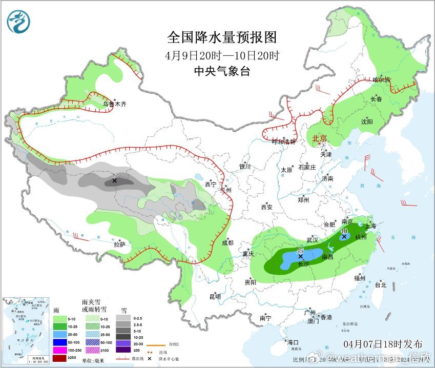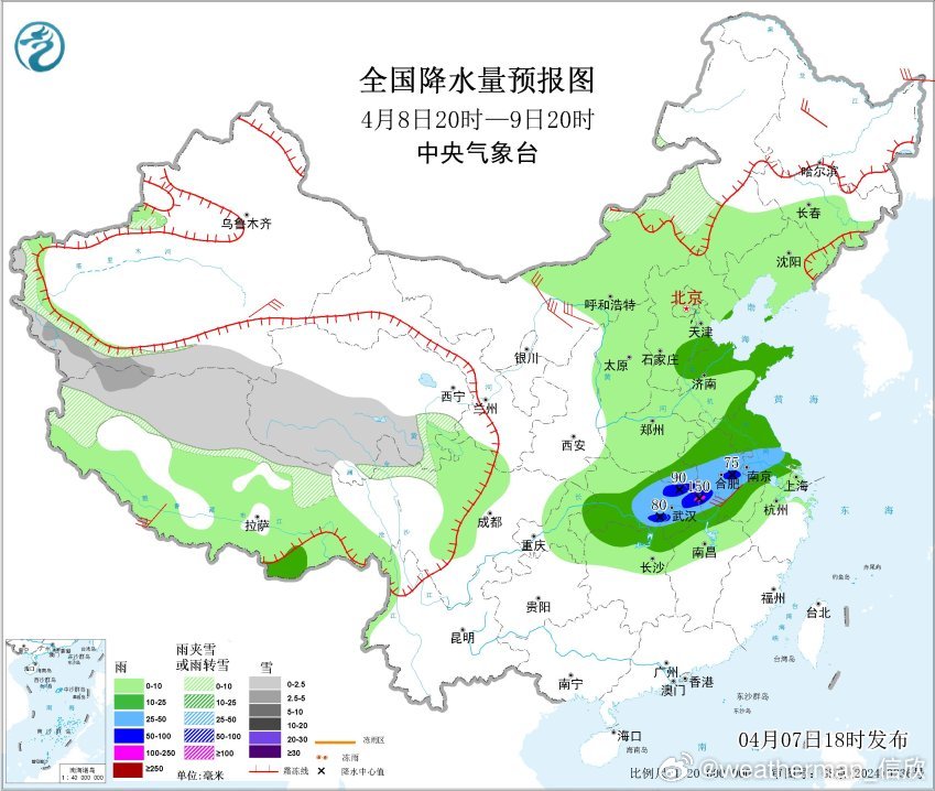 预计4月8日20时至9日20时,新疆南疆西部山区、青海南部、西藏北部、川西高原北部等地部分地区有小到中雪或雨夹雪;黄淮东部、江淮大部、江汉大部、湖南北部、江西北部等地部分地区有中到大雨,其中,湖北东部、苏皖西部等地部分地区有暴雨或大暴雨(100~150毫米)。