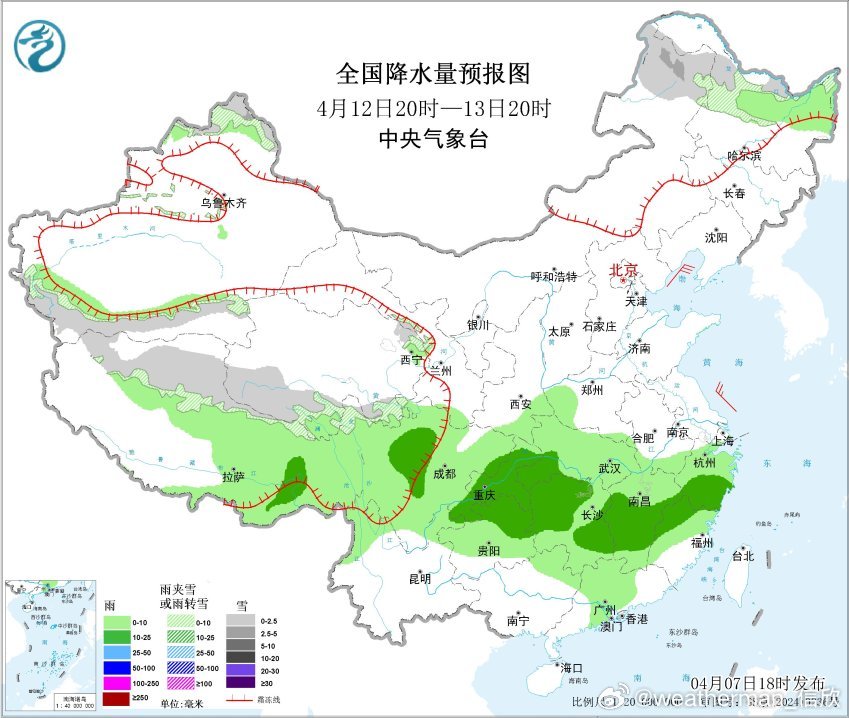 预计4月7日20时至8日20时,新疆南疆西部山区、西藏西部和东部、青海北部和南部、川西高原北部、黑龙江北部等地部分地区有小到中雪或雨夹雪,其中,西藏西部局地有暴雪(10~12毫米);