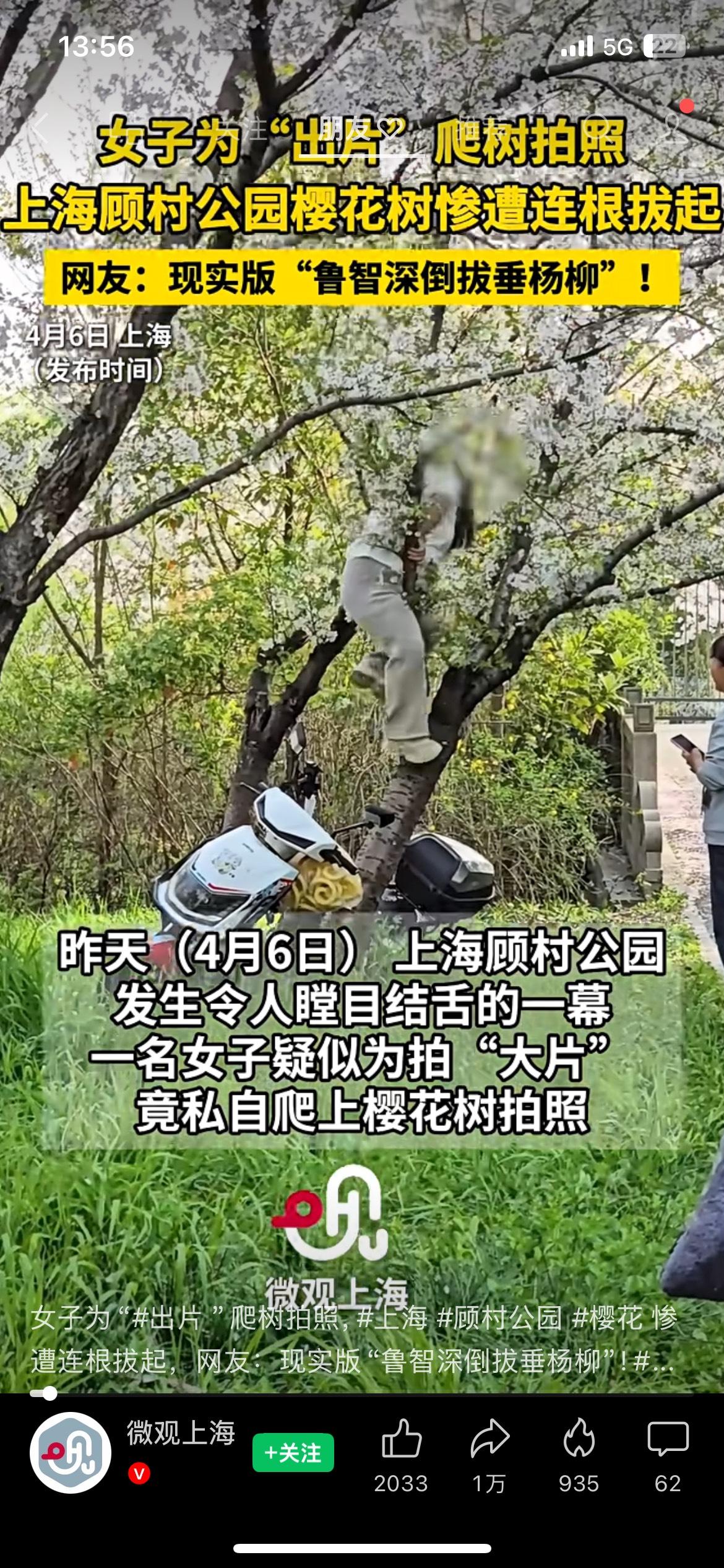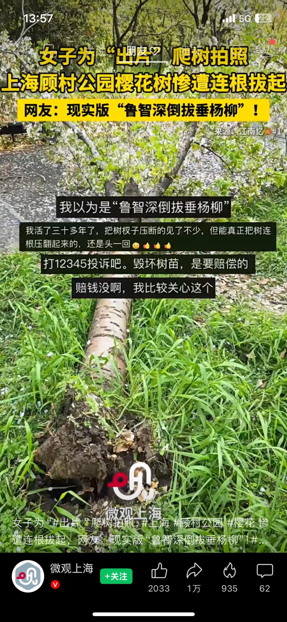 给我看笑了顾村公园樱花树被连根拔起!就为拍一张照片,值得吗? 上海顾村公园,一名游客为拍照爬树,直接把樱花树连根拔起,树根裸露,树木彻底报废。好好的春日美景,被一己私欲毁掉,网友看得又气又可惜。美景需要每个人守护,爬树摇花、破坏绿植,不仅没素质,还可能面临赔偿。别为了一张朋友圈照片,丢掉最基本的公德心。你觉得这事该怪游客素质,还是公园管理不到位?评论区站队。 顾村公园 樱花树被拔 不文明旅游