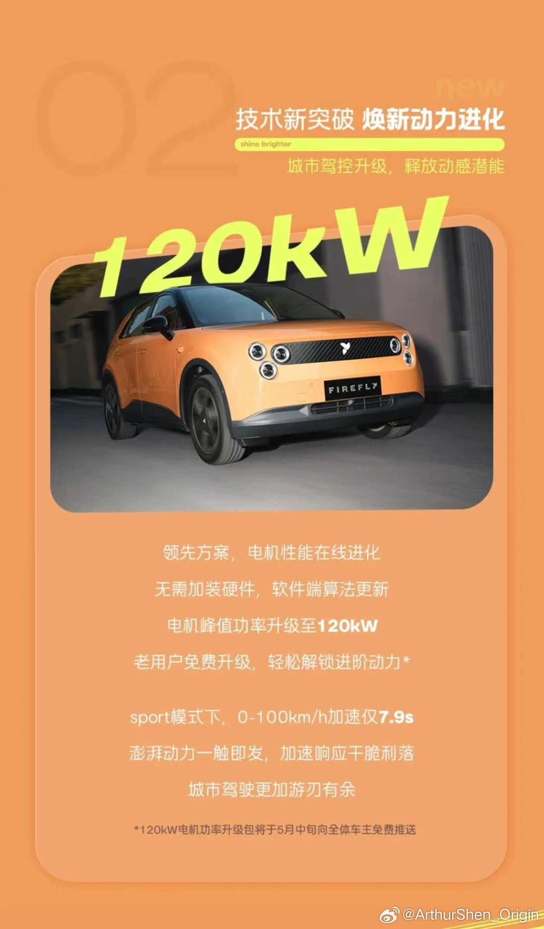 ✅新款电机功率升级为120kW,老款用户可以通过车机OTA升级电机功率。