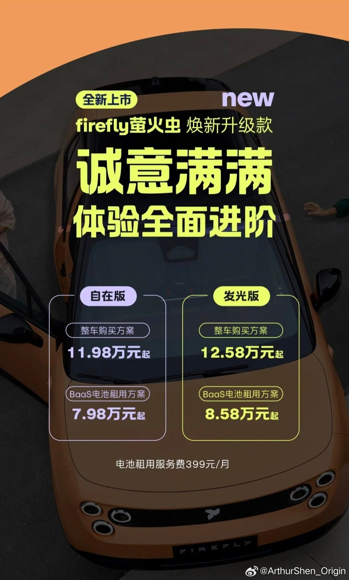 发光版:整车购买12.58万元起,BaaS租电方案8.58万元起。