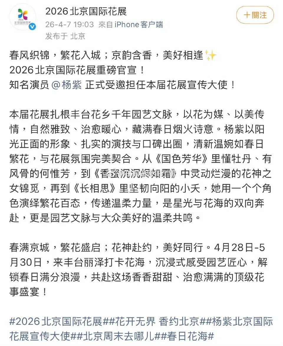 杨紫官宣北京国际花展宣传大使,花神降临,众生逢春