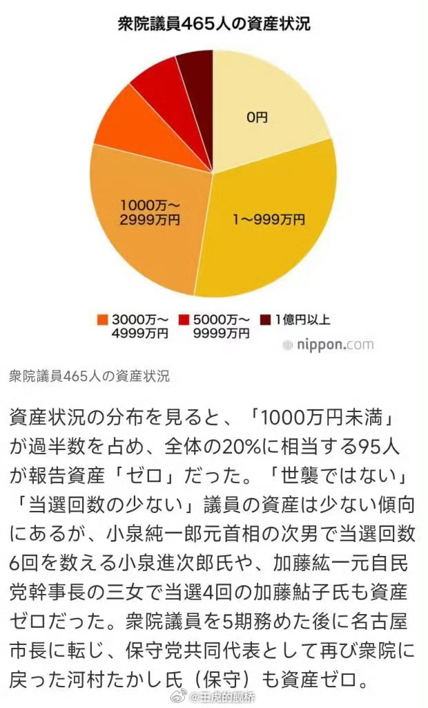 按这个申报,日本国会议员里有20%零资产,50%在1000万日元以下。