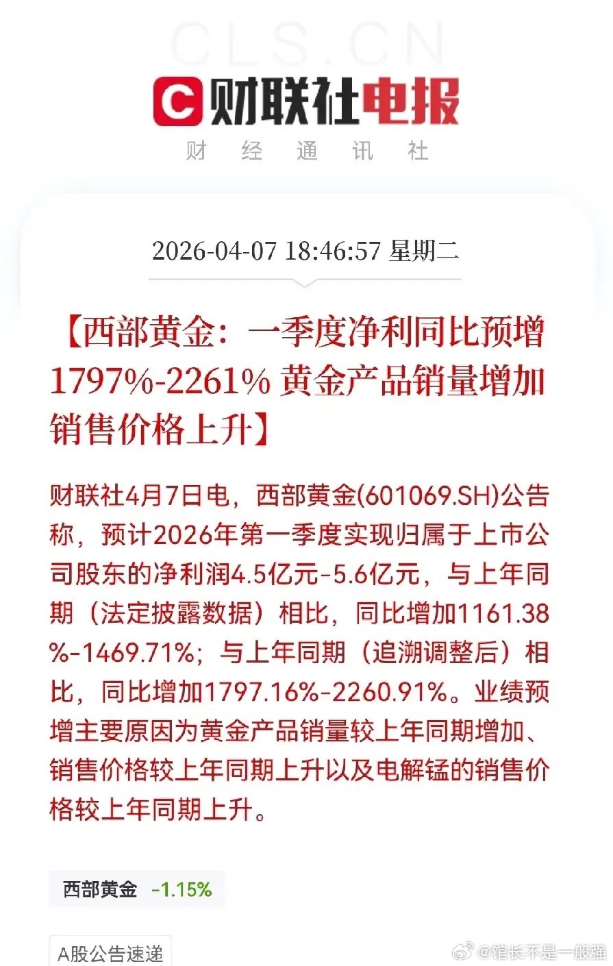 一季报炸裂啊!太厉害,简直不敢相信是真的,这个业绩太牛了,持有这家公司的明天妥妥的要吃大肉肉了,太香了,真的是抱到了一颗黄金树了,七八万多中小股东今晚真的要开大香槟庆祝一下,手里有这么好业绩的公司,真的是走大运,明天恐怕要一字板了吧晚间6点46分,黄金板块的热门公司之一西部黄金率先披露了2026年一季度的业绩预告,预计一季度归母净利润4.5亿-5.6亿元,与上年同期相比同比增长了1797.16%-2260.91%,我还以为信息有印刷错误,经过再三确认,并反复放大了看了好多遍,发现没有任何问题,真的是同比增长了17倍到22倍,这个业绩预告出来后,股民们的兴致被点燃,议论纷纷,都认为要么三个板起步,要么五个板,要么更多板,总之明日这一个板应该是板上钉钉了,手到擒来了,七八万中小股东的好日子终于又要来了,尤其是要恭喜今日刚刚上车的朋友们,睡一觉醒来就能喜提一字板了,想想就开心呀股票黄金