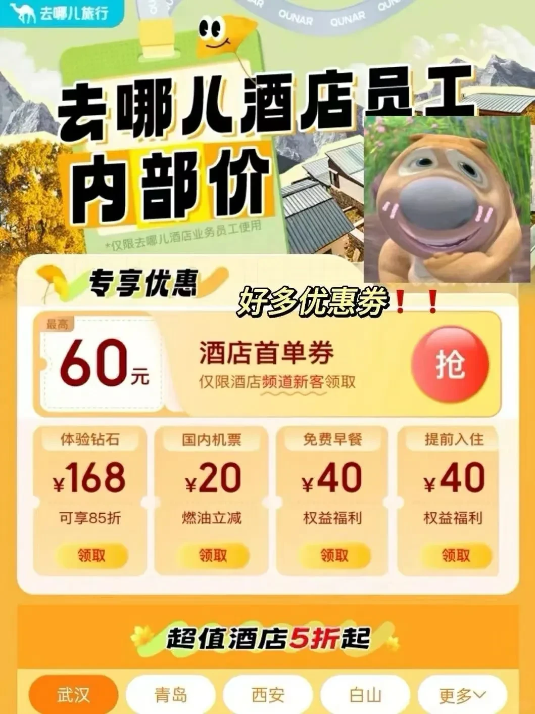 🎁酒店优惠券60新用户5⃣折起!