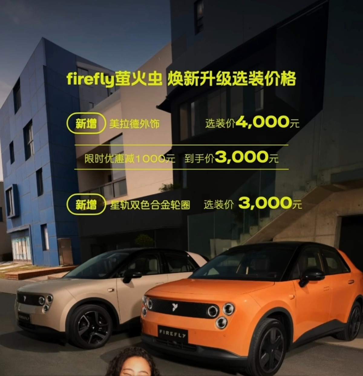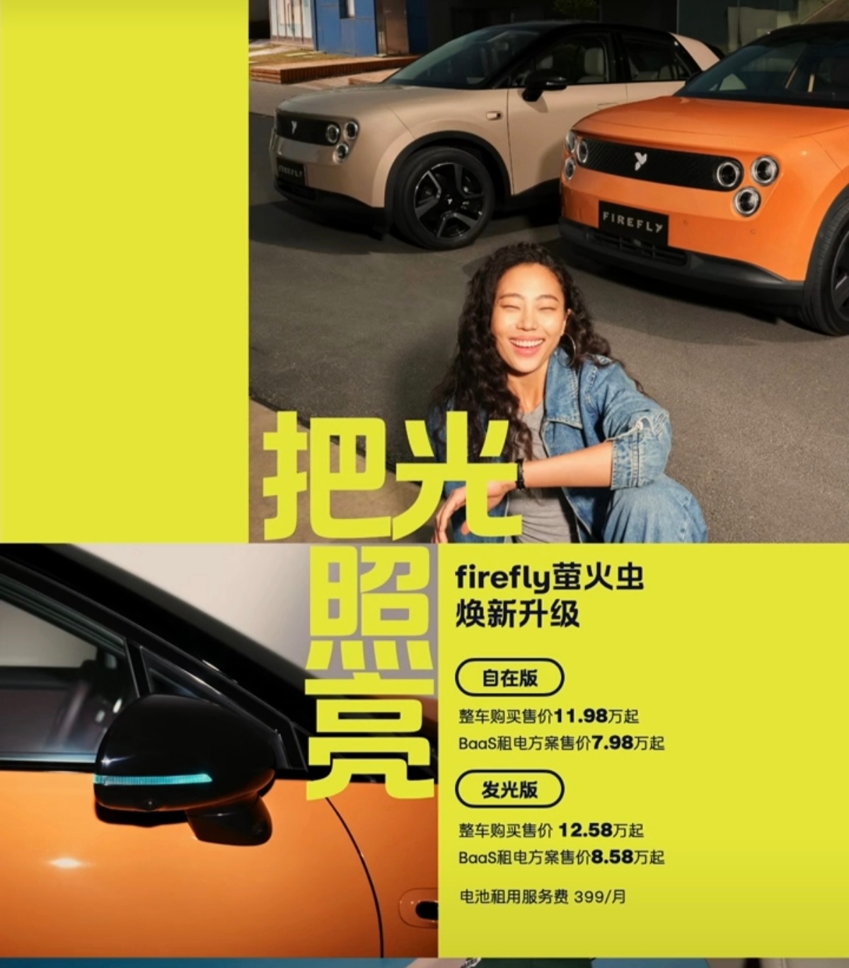 萤火虫焕新款,BaaS后自在版7.98万起,发光版8.58万。