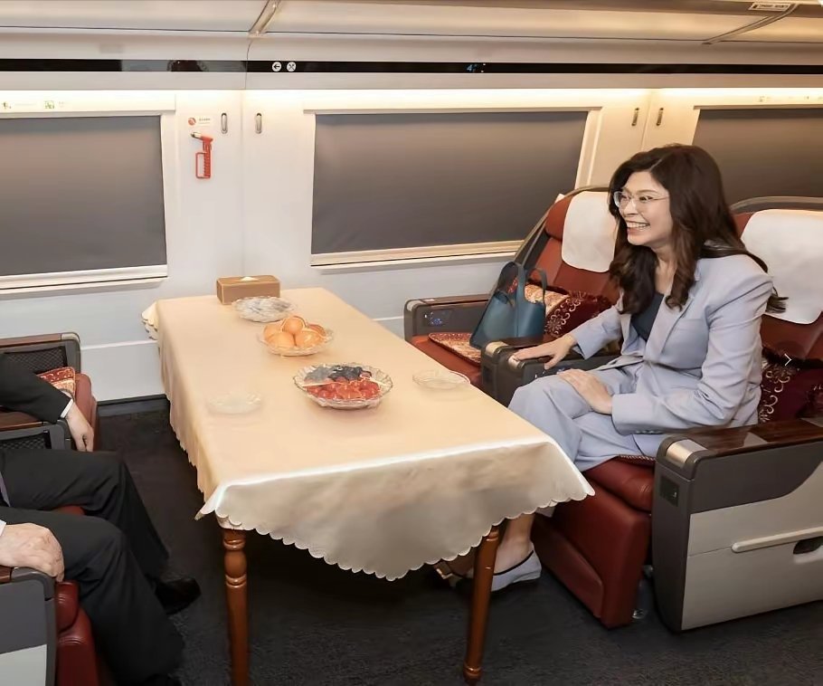 郑丽文抵达大陆首日,乘坐城际高铁去南京。看样子心情不错。
