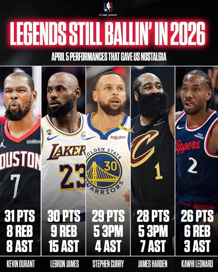 昨天一天,联盟依旧是靠老一辈撑起来的一天!杜兰特31+8+8、詹姆斯30+9+15、库里29+5三分+4助攻、哈登28+5三分+7助攻、伦纳德26分+6+3。 十年前的风气是35岁,老将不死,华丽巡演(实际到处送温暖,备受尊重)整天感动自己哭的一塌糊涂,现在是35岁以后都是奋斗年纪,哪里有什么老兵不死,都得干!