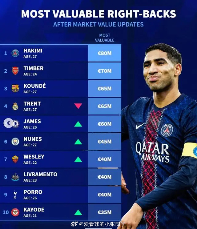 紧随其后的孔德与阿诺德均以6500万欧元并列第三,里斯·詹姆斯以6000万欧元位居第五。从榜单分布来看,英超与西甲球员占据绝大多数席位,英超联赛更是成为顶级右后卫的聚集地,多名年轻新星跻身前十,显示出足坛边路位置的更新换代正在加速。