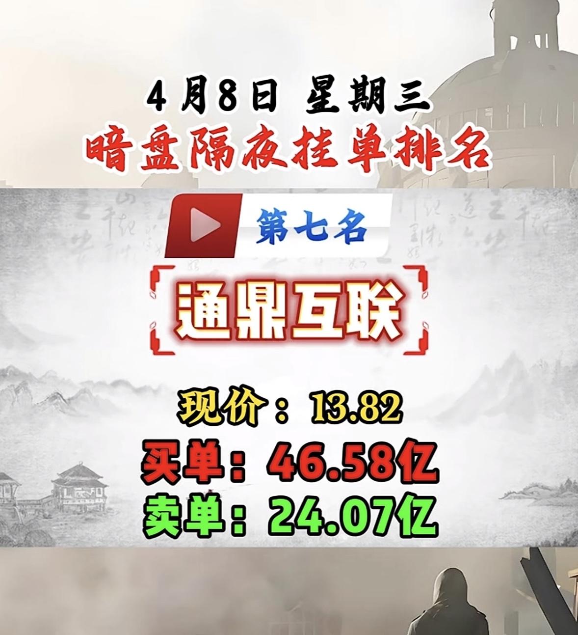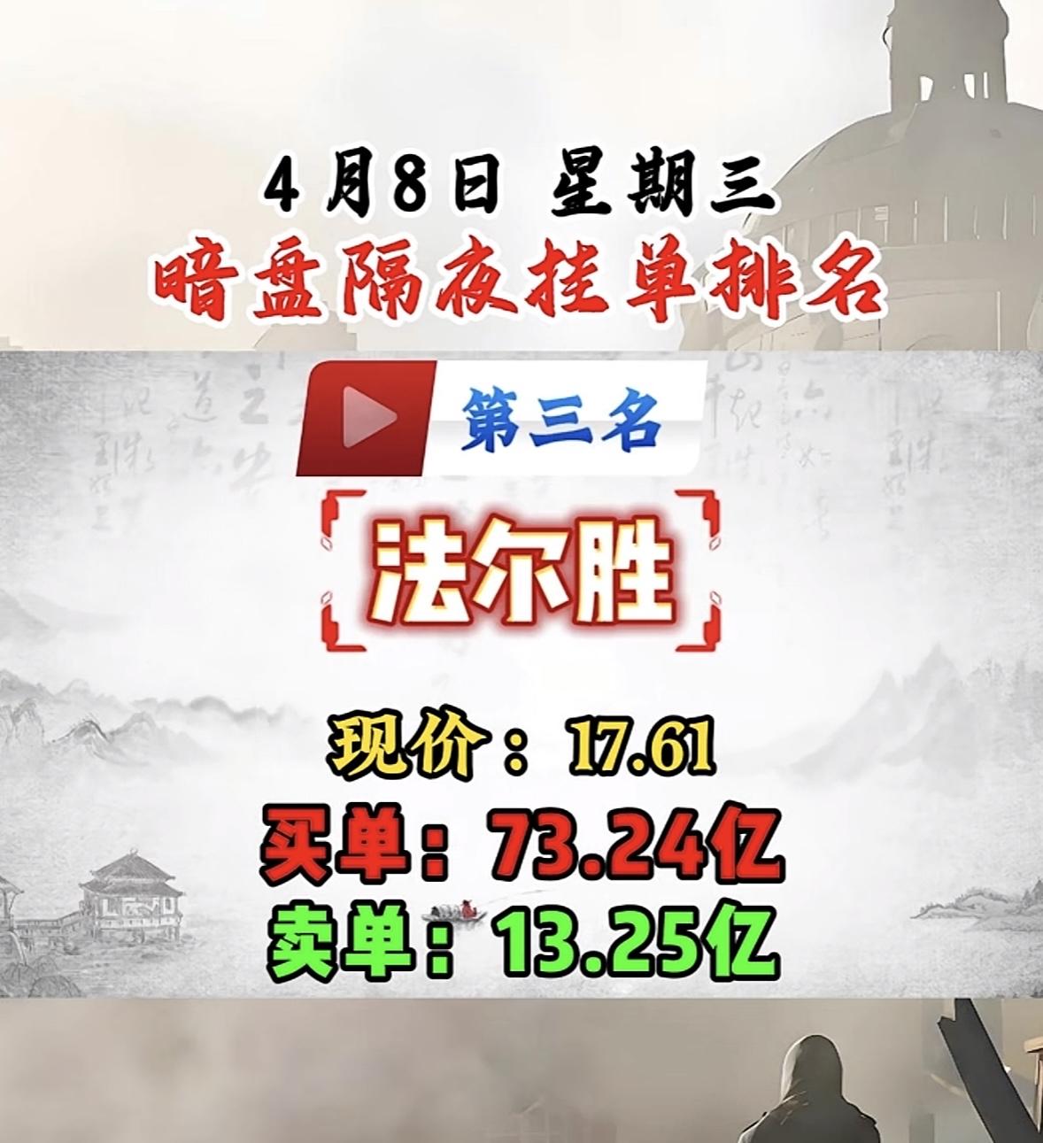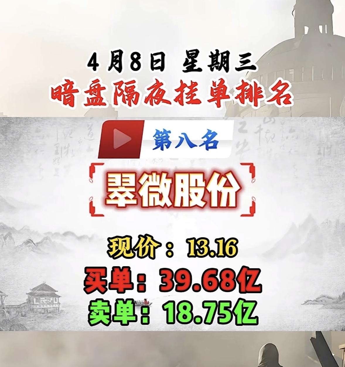 4月8日周三暗盘隔夜挂单排行榜揭晓 4月8日暗盘隔夜挂单排名第八名是翠微股份。4月7日A股暗盘呈现“低位抢筹、高位分歧”格局,隔夜挂单集中布局低位科技、化工、农业板块。像通宇通讯挂单金额达53.28亿,福晶科技挂单51.93亿等,资金重点博弈低位核心资产。 翠微股份能在隔夜挂单中排第八,说明也吸引了不少资金关注。不过目前其交易状态相关数据暂未明确。其还有2026年的年报预约披露等相关大事提醒。在当下这种暗盘资金格局下,翠微股份后续走势值得留意。