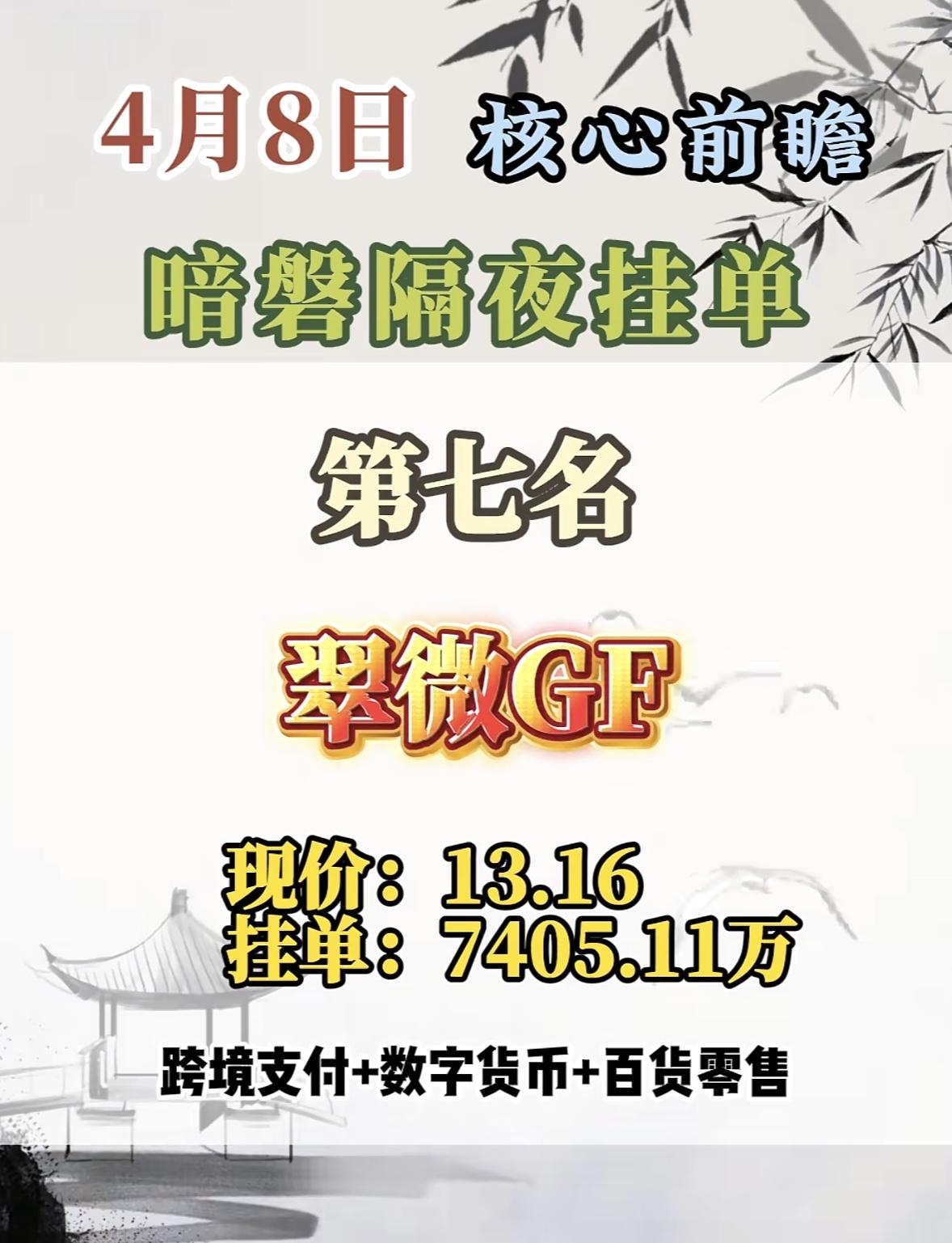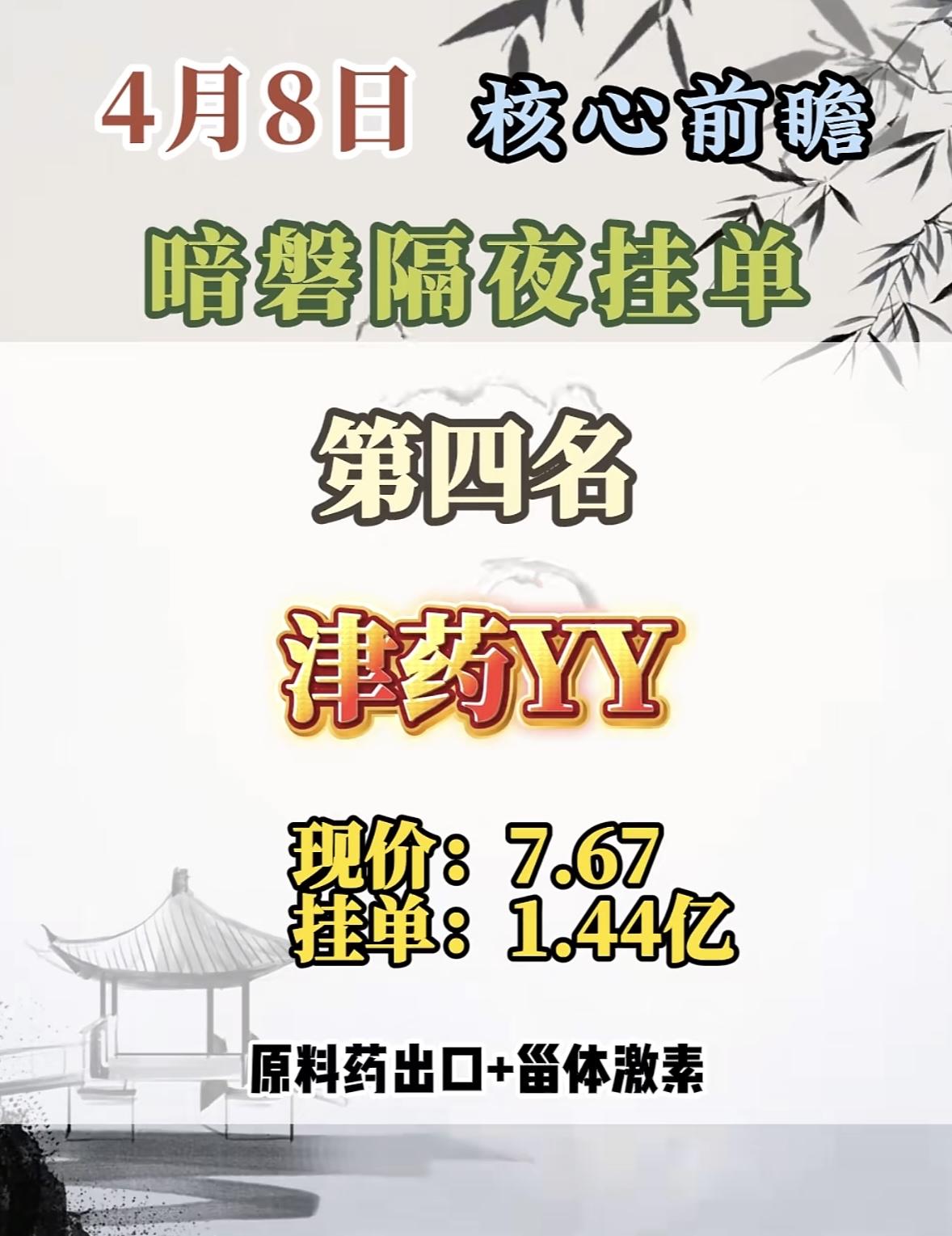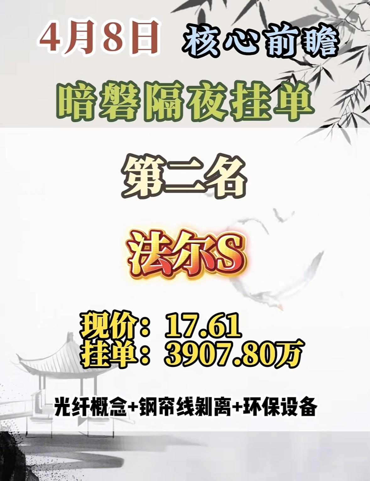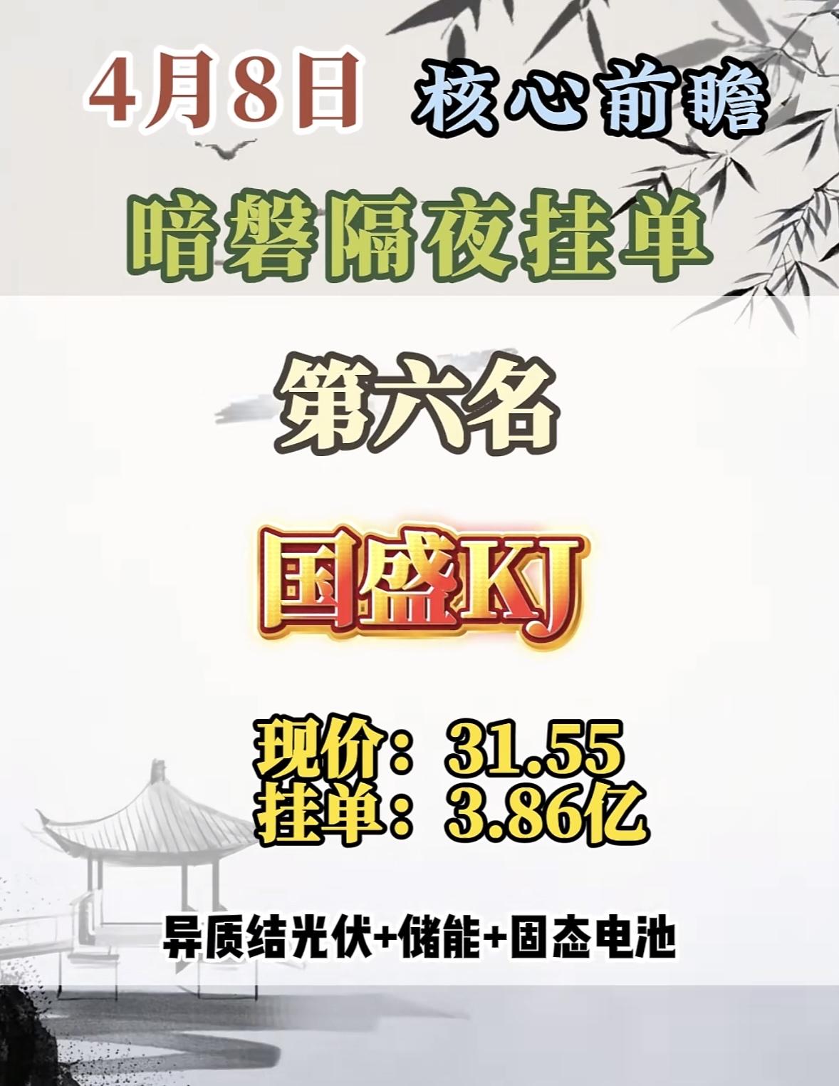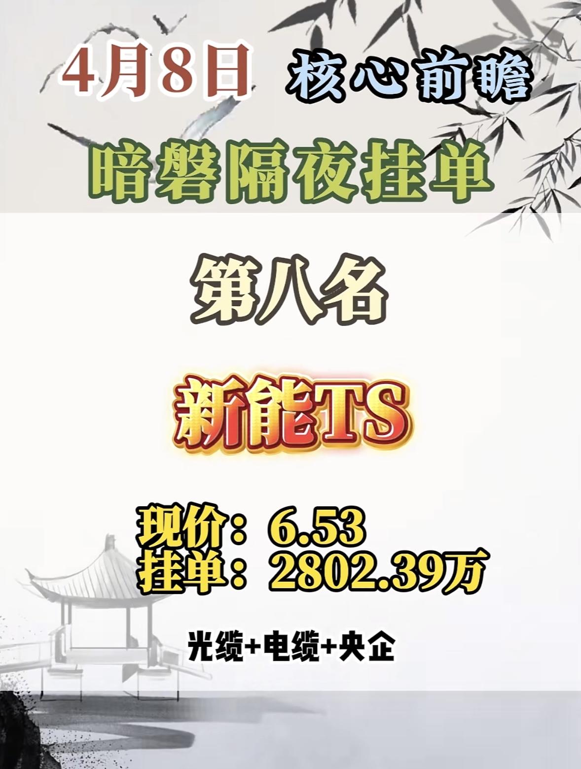 4月8日周三暗盘隔夜挂单排行榜出炉 4月8日的暗磐隔夜挂单,新能泰山这匹黑马要强势登场啦!这股之前表现相当亮眼,2026年3月23 - 26日连收4个涨停板,累计上涨46.54%,截至9:33报5.51元,成交金额6.47亿元。2025年4月28日也曾涨停收盘,股价涨10.14%。 它涨停原因很给力,一季报扭亏,2025年一季度营收2.99亿,同比增74.53%,归母净利润1623.16万元,同比扭亏为盈。还有产业园开发,江山汇是南京鼓楼重点项目,且有央企背景。近2年放量涨停后次日上涨概率60.76%,这次新能泰山说不定又能带来惊喜,值得关注!
