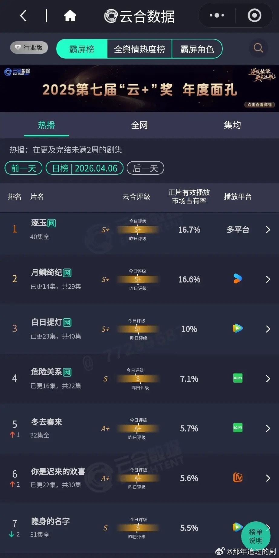 2026.4.6剧集热度榜杀疯了!逐玉断层领跑,黑马剧逆袭太猛《逐玉》以16.7%的正片有效播放占比断层登顶,S+评级稳坐第一,多平台发力直接杀疯了!第二名《月鳞绮纪》紧追不舍,16.6%的占比差距微乎其微,S+评级全程在线,后续反超悬念拉满!