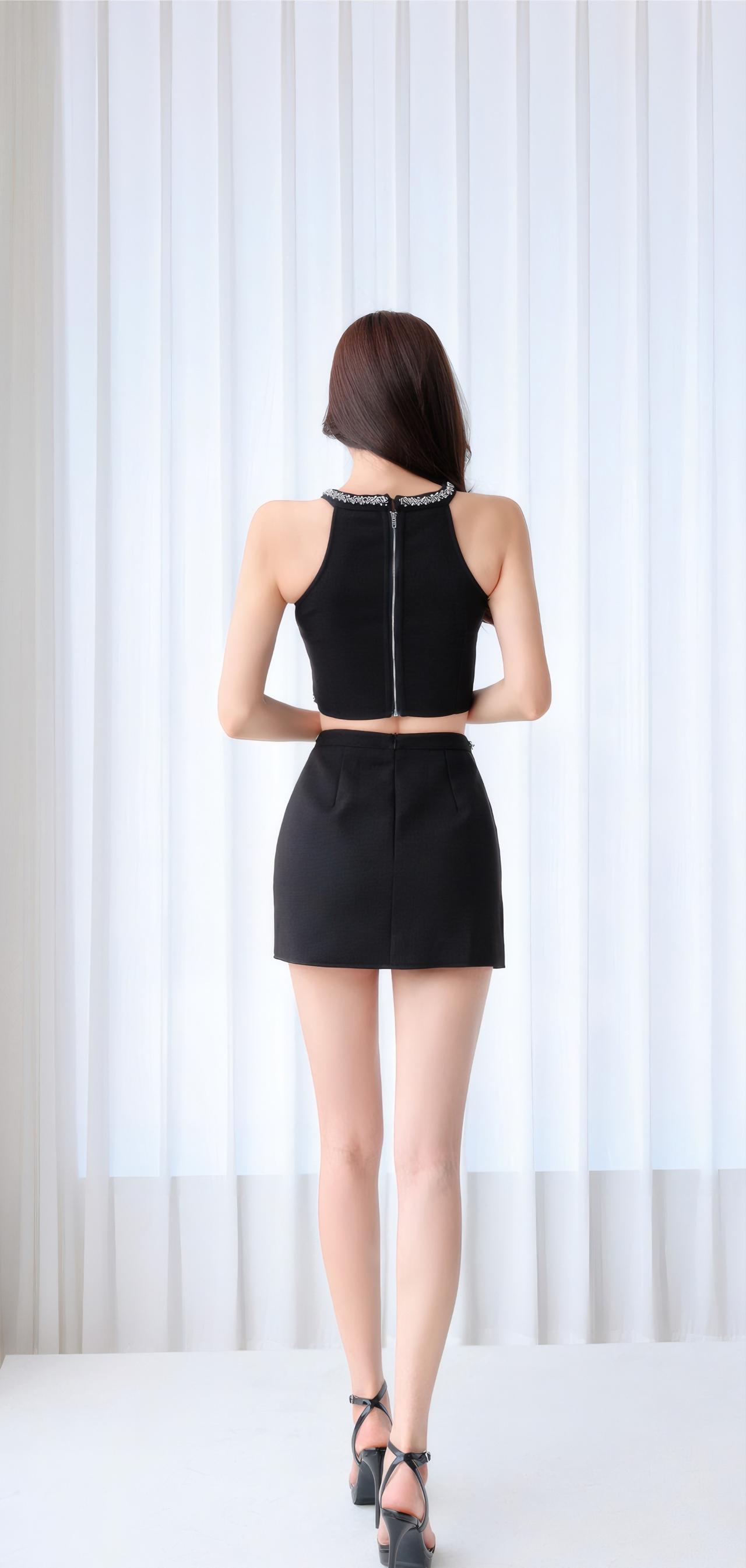 黑色露脐装搭配高腰短裙,优雅迷人,尽显时尚魅力!