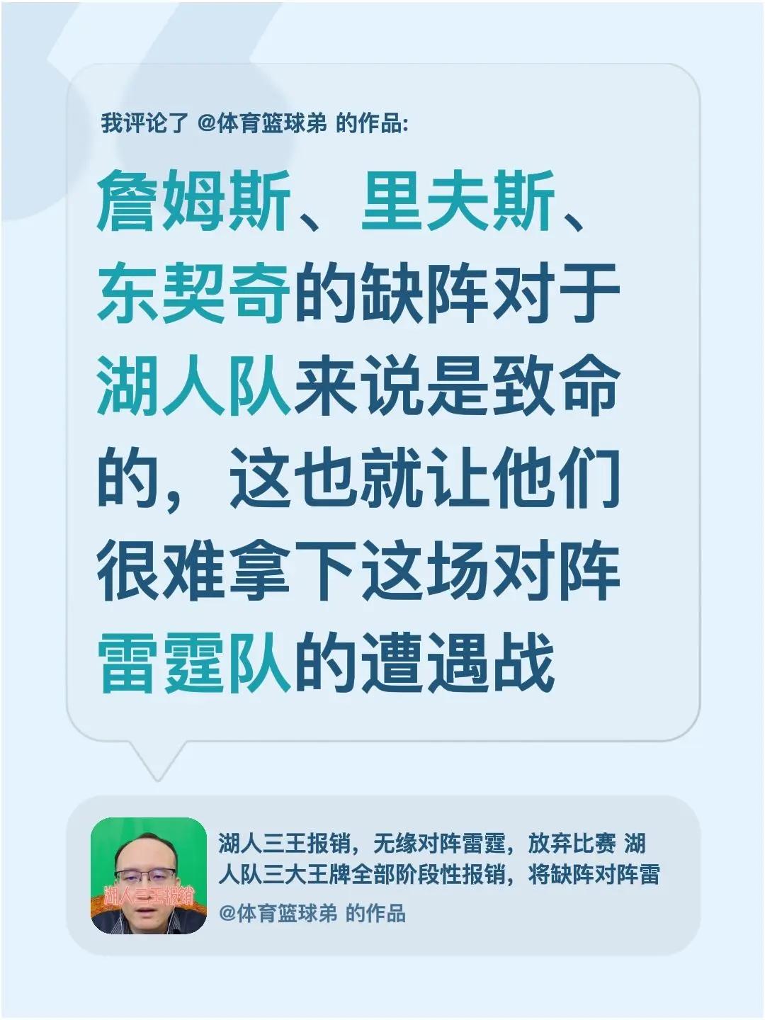 我评论了@体育篮球弟 的作品:詹姆斯、里夫斯、东契奇的缺阵对于湖人队来说是致命的,这也就让他们很难拿下这场对阵雷霆队的遭遇战