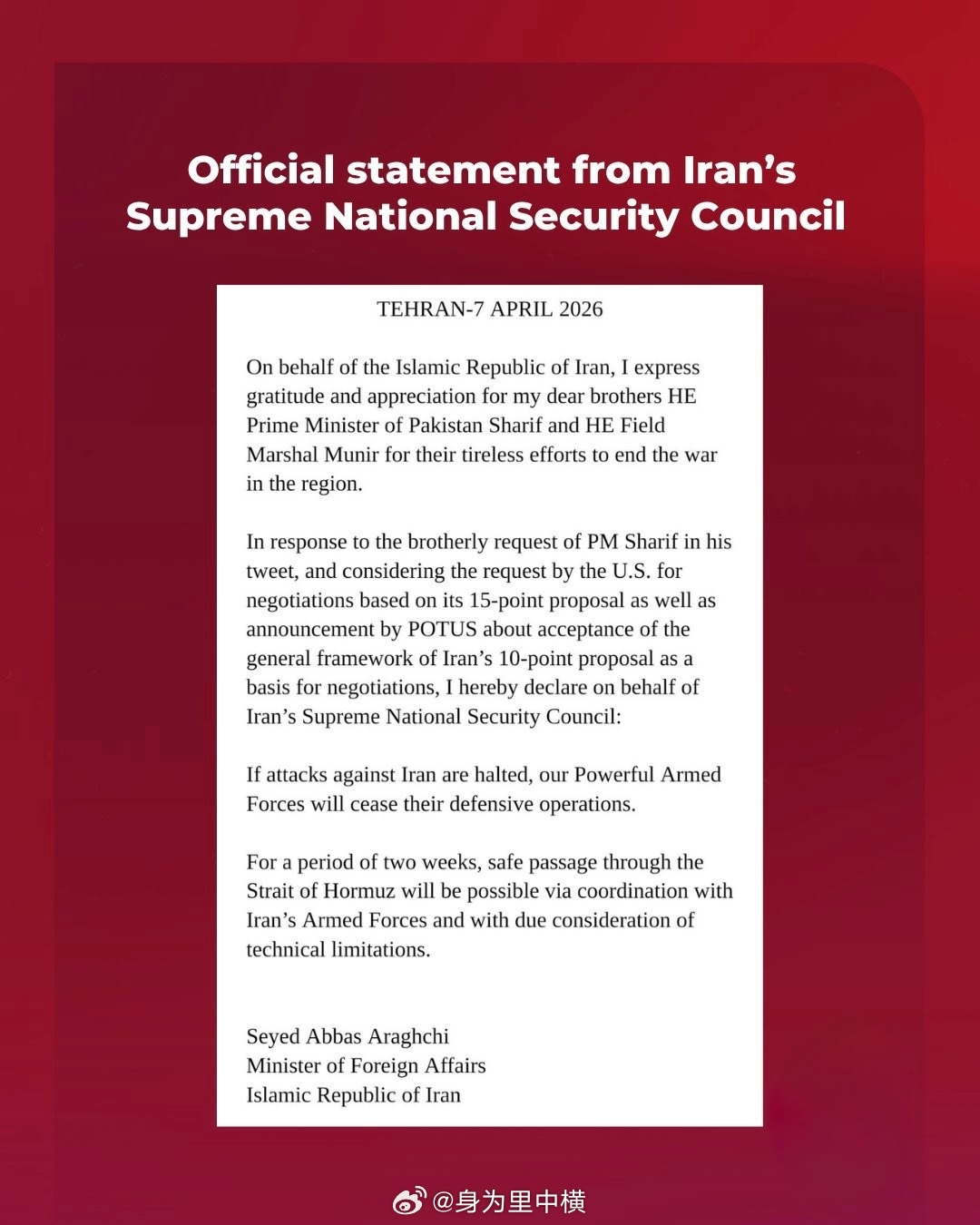 【伊朗外长称若攻击停止将停止防御】2026年4月7日,伊朗外交部长 Araghchi(阿卜杜拉希扬·阿拉格奇)代表最高国家安全委员会发表声明,表示如果针对伊朗的攻击停止,伊朗将相应停止防御行动。此声明被视为对冲突暂停的条件性回应。👉该表态预示美伊冲突可能出现条件性暂停,为潜在停火谈判打开窗口,但实际效果取决于美国及相关方是否停止军事行动。目前紧张局势仍存,地区和平前景尚不确定。