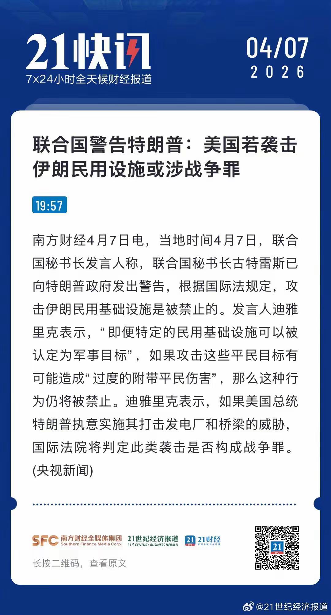当地时间4月7日,联合国秘书长发言人称,联合国秘书长古特雷斯已向特朗普政府发出警告,根据国际法规定,攻击伊朗民用基础设施是被禁止的。 发言人迪雅里克表示,“即便特定的民用基础设施可以被认定为军事目标”,如果攻击这些平民目标有可能造成“过度的附带平民伤害”,那么这种行为仍将被禁止。 迪雅里克表示,如果美国总统特朗普执意实施其打击发电厂和桥梁的威胁,国际法院将判定此类袭击是否构成战争罪。 网友表示: 措辞十分委婉,联合国没有实权的空架子。缴纳的会费有何用? 第一颗导弹砸到人家地面就属于战争罪了 对此,你怎么看?