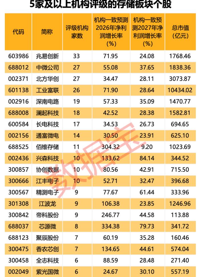 香农芯创今年一季度净利润超过2025年全年!屌炸了!今天存储板块又是大涨! 2026年以来,全球DRAM厂商几乎不约而同开启了涨价周期。本轮DRAM涨势主要由全球AI投资的爆发性增长所驱动,AI服务器对内存的消耗量巨大,为满足高利润的AI芯片需求,存储厂商纷纷将产能转向HBM和高端DDR5,直接导致通用DRAM供给大幅缩减。 4月7日晚间,存储芯片概念股香农芯创发布2026年第一季度业绩预告,预计实现归母净利润11.4亿元—14.8亿元,同比大幅增长6714.72%—8747.18%,超过公司2025年度业绩快报全年净利润。除香农芯创外,存储板块个股中还有德明利日前发布第一季度业绩预告,预计实现归母净利润31.5亿元—36.5亿元,由上年同期亏损6908.77万元转为巨额盈利。 据证券时报·数据宝统计,A股市场属于存储板块的个股共有55只,在存储涨价的热潮下,概念股备受机构关注,24股获5家及以上机构评级,占比超过总数的四成。根据5家及以上机构一致预测,上述24股均有望在2026年、2027年实现净利润持续增长,且增幅均值在20%以上。