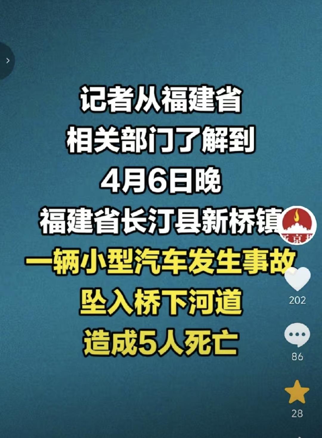 4月6号晚上10点多,长汀新桥镇门楼桥廊那儿,一辆小客车突然冲下桥,掉进溪里。官方第二天下午确认,5个人都没了,人已经都找到了。 当时正下大雨,一小时下了42毫米,风还挺大,路上能见度很低。那座桥是仿古廊桥,去年底刚查过,护栏和排水都说是合格的,但没说夜里下雨有没有反光标线,也没提弯道那边视野咋样。 网上说车上还有3个孩子,这个没见政府提。司机是不是开太快、车子有没有问题、桥到底有没有隐患——这些都还在查,省里专家7号就过去了。 救援还算快,25分钟队伍就到了,警车、冲锋舟、照明设备全拉过去了。不过溪流急,夜里找人还是难。 事故地点是县道上的小弯道,外边就是溪,路窄,没路灯,雨天特别容易打滑。这种路在闽西很多,平时走的人不少,但真出事,反应时间很短。 官方通报挺克制,没讲原因,没讲细节,只说“正在调查”。该说的说了,不该猜的没猜。 这事还没完。