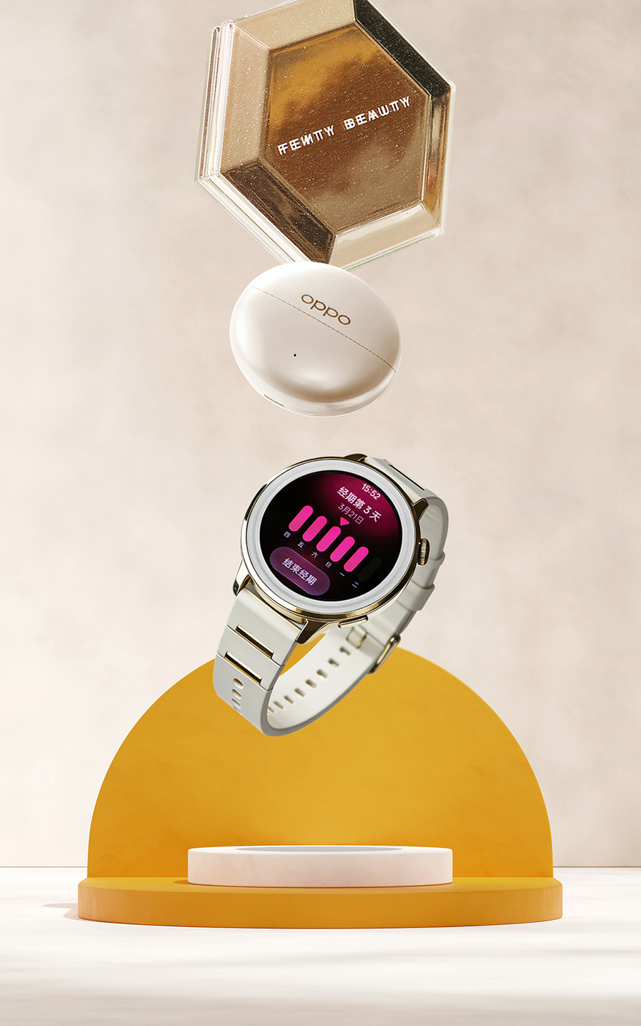 OPPO和FENTY BEAUTY联名款“我的高光时刻”礼盒!里面有:小金表OPPO Watch X3 Mini + 超闪的小金环OPPO Enco Clip2 + FENTY BEAUTY的星钻高光粉饼,简直是宝藏女孩的完美搭配!💖