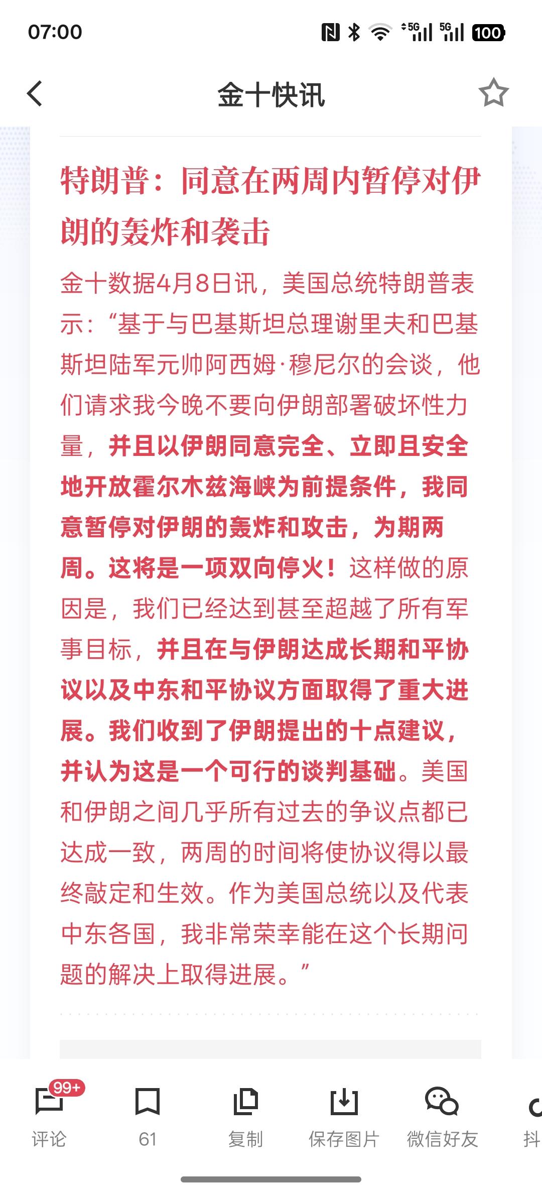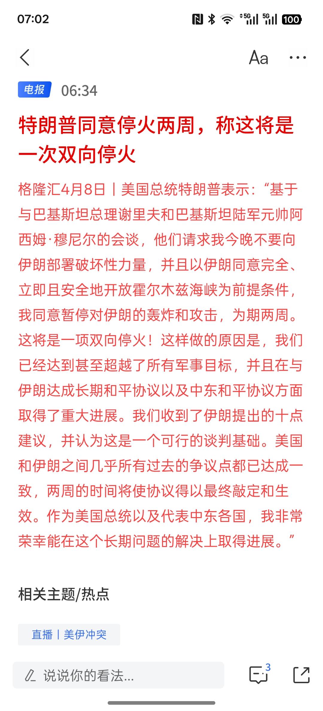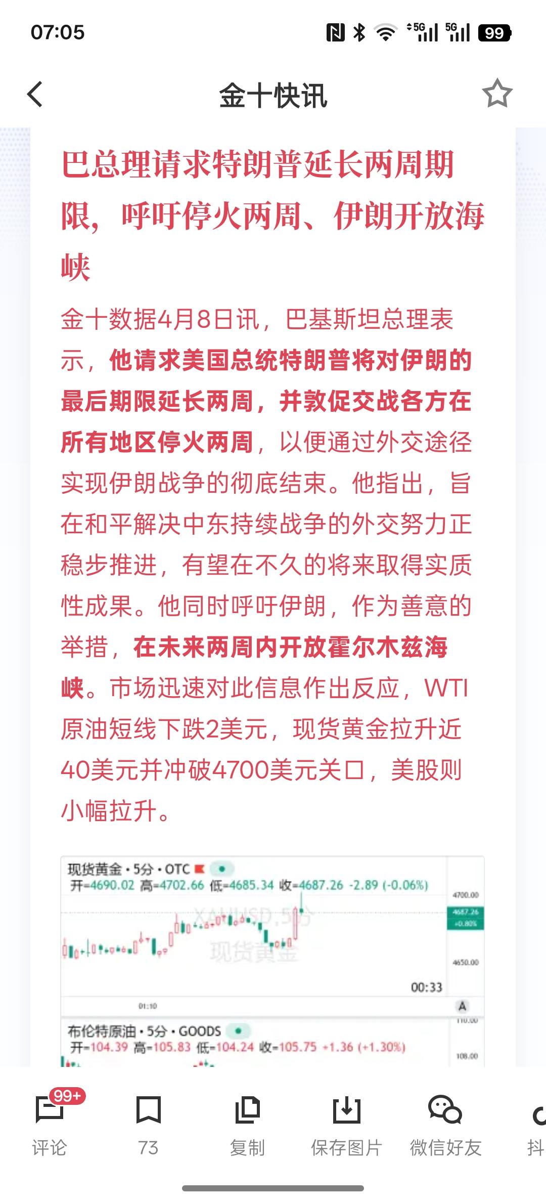 受到美国与巴基斯坦停火两周的消息,原油价格在短短几分钟从110美元直接跌到70美元左右!如果接下来美国与伊朗在这十天半个月之间进行谈判,如果能达成协议,那买原油的买在110美元左右的位置,那基本上未来就很难再达到这个位置卖出!基本上就被套牢!未来的原油价格可能就在70到50美元左右,只要不发生战争,尤其是中东地区达成和平协议,甚至永久性的停火。那么,原油的价格基本上就不可能再回到100美元左右! 资本市场未来将迎来一个比较好的行情走势! 受到伊朗与美国之间的停火,整个资本市场今天迎来了一个大幅上涨的局势!