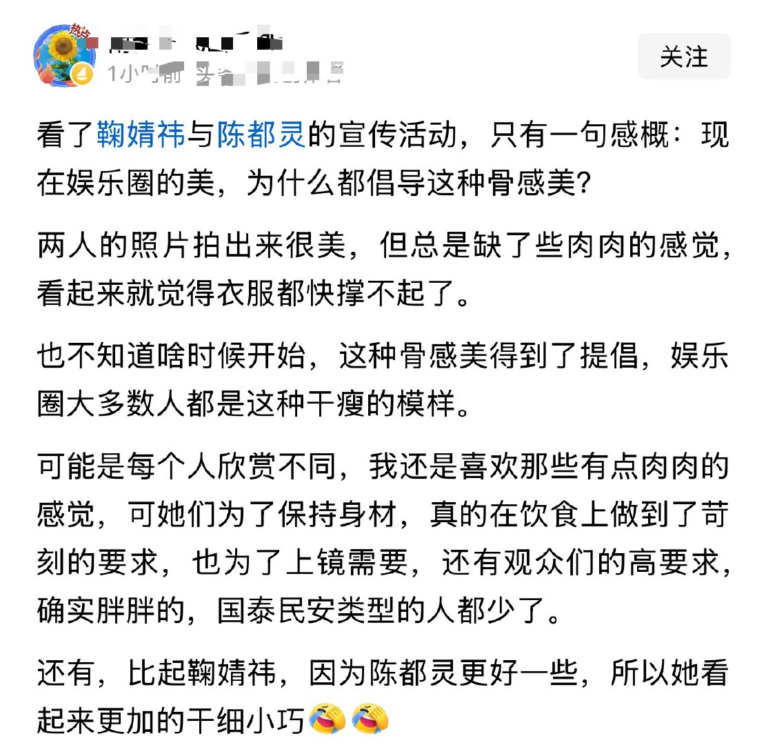 看了鞠婧祎与陈都灵的宣传活动,只有一句感概:现在娱乐圈的美,为什么都倡导这种骨感美?