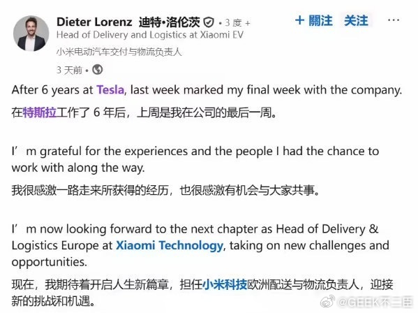 小米汽车为进军欧洲做准备据报道,小米现已聘请特斯拉中欧地区交付运营高级经理迪特 · 洛伦茨(Dieter Lorenz),担任欧洲交付与物流负责人。