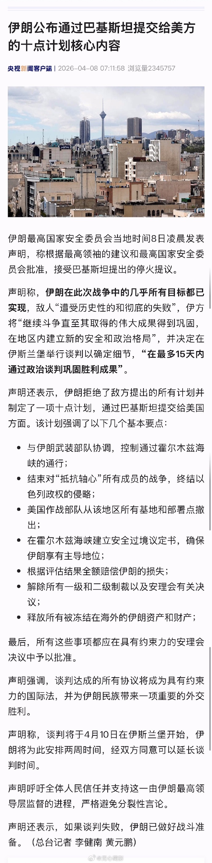 伊朗战事最新进展【伊朗公布10项停战条款主要内容】伊朗4月8日公布10项停战条款