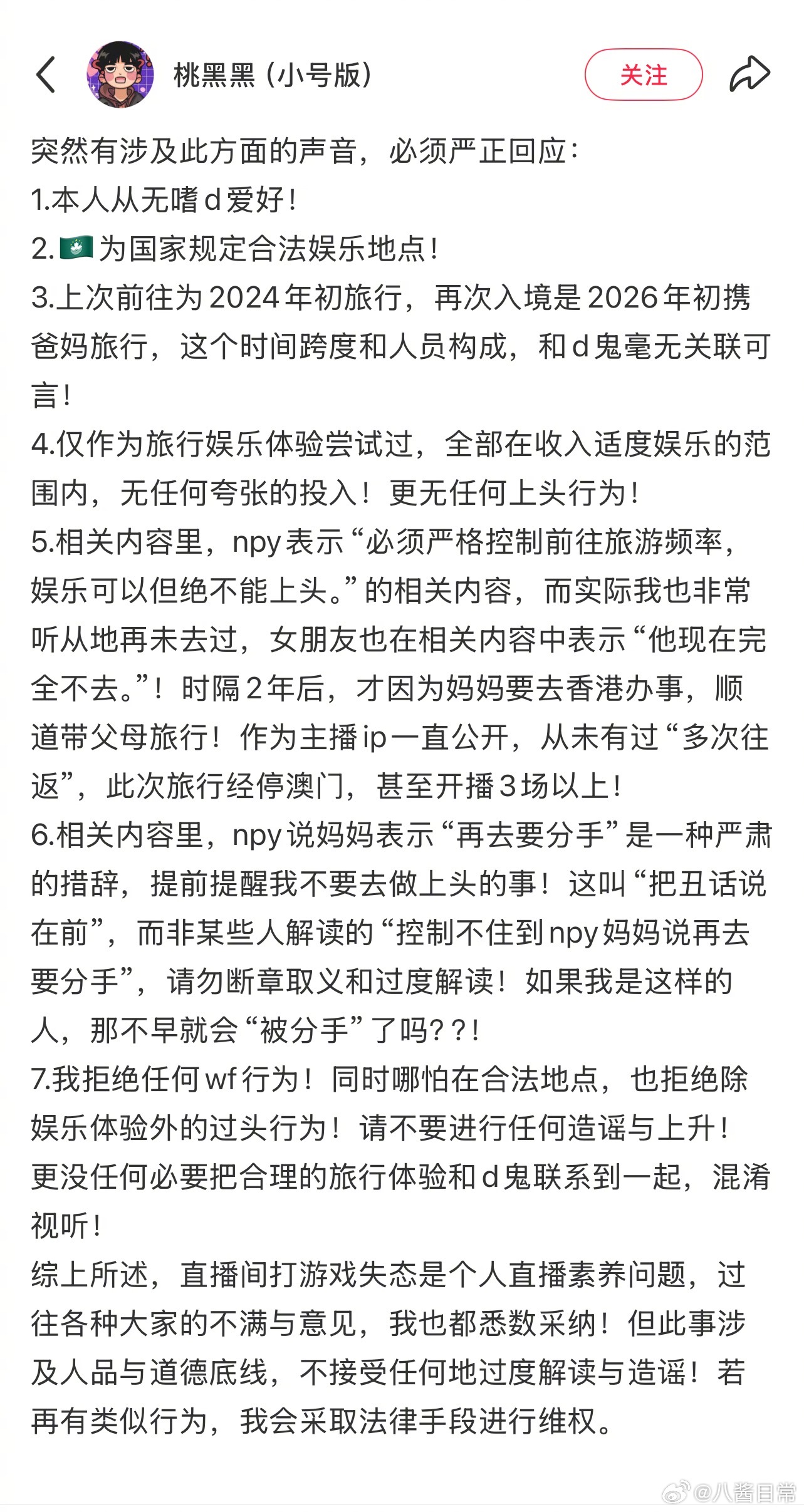 桃黑黑否认赌博成瘾,并表示此生不会再去澳门