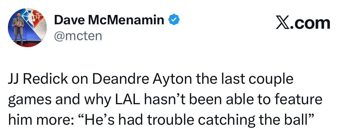 雷迪克谈及艾顿过去几场的表现,以及湖人为何没能更多地围绕他展开战术时表示:“他在接球环节一直存在问题。”