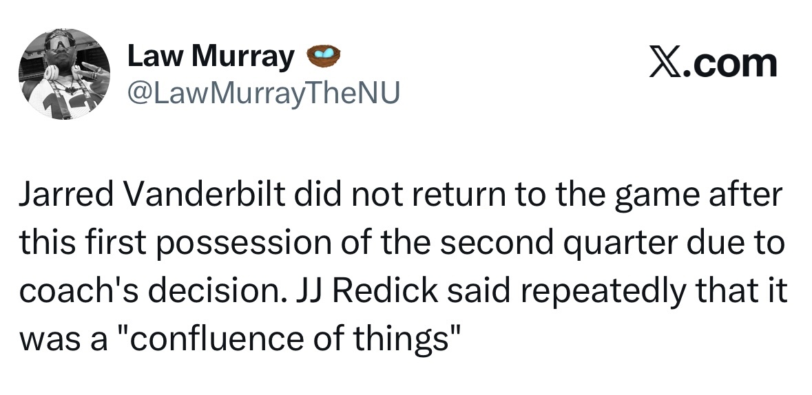 范德比尔特在第二节首个进攻回合后,因教练的决定未再登场比赛。