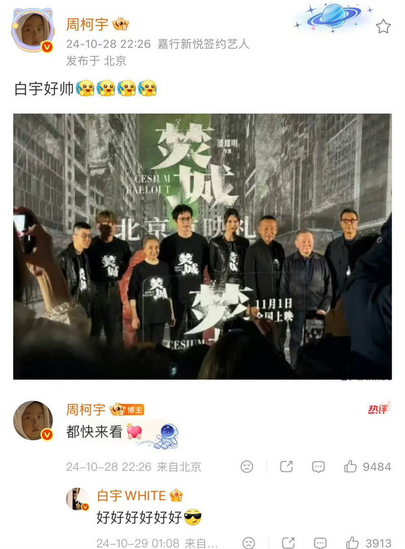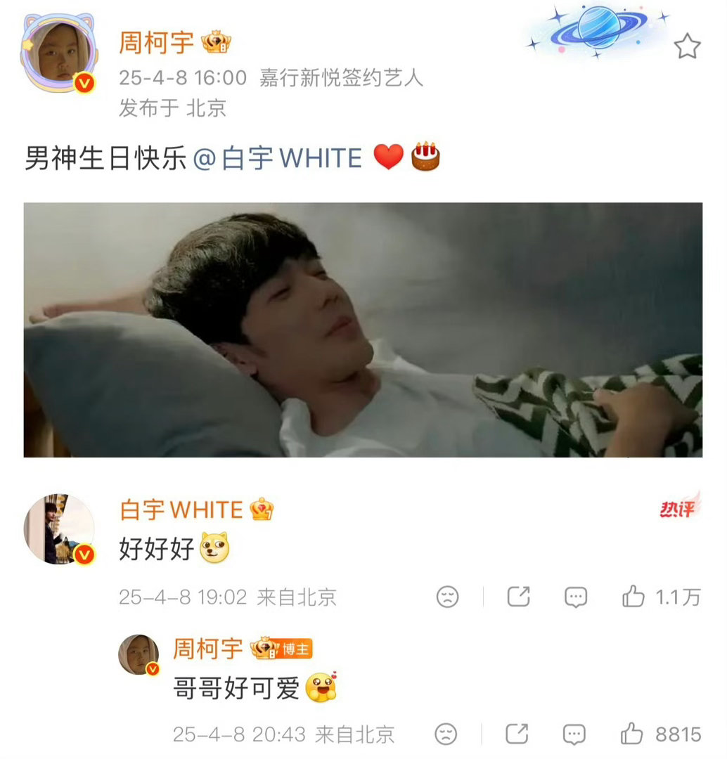周柯宇发六个爱心给白宇庆生今天白宇生日周柯宇发了六个爱心为白宇庆生,两位大帅哥