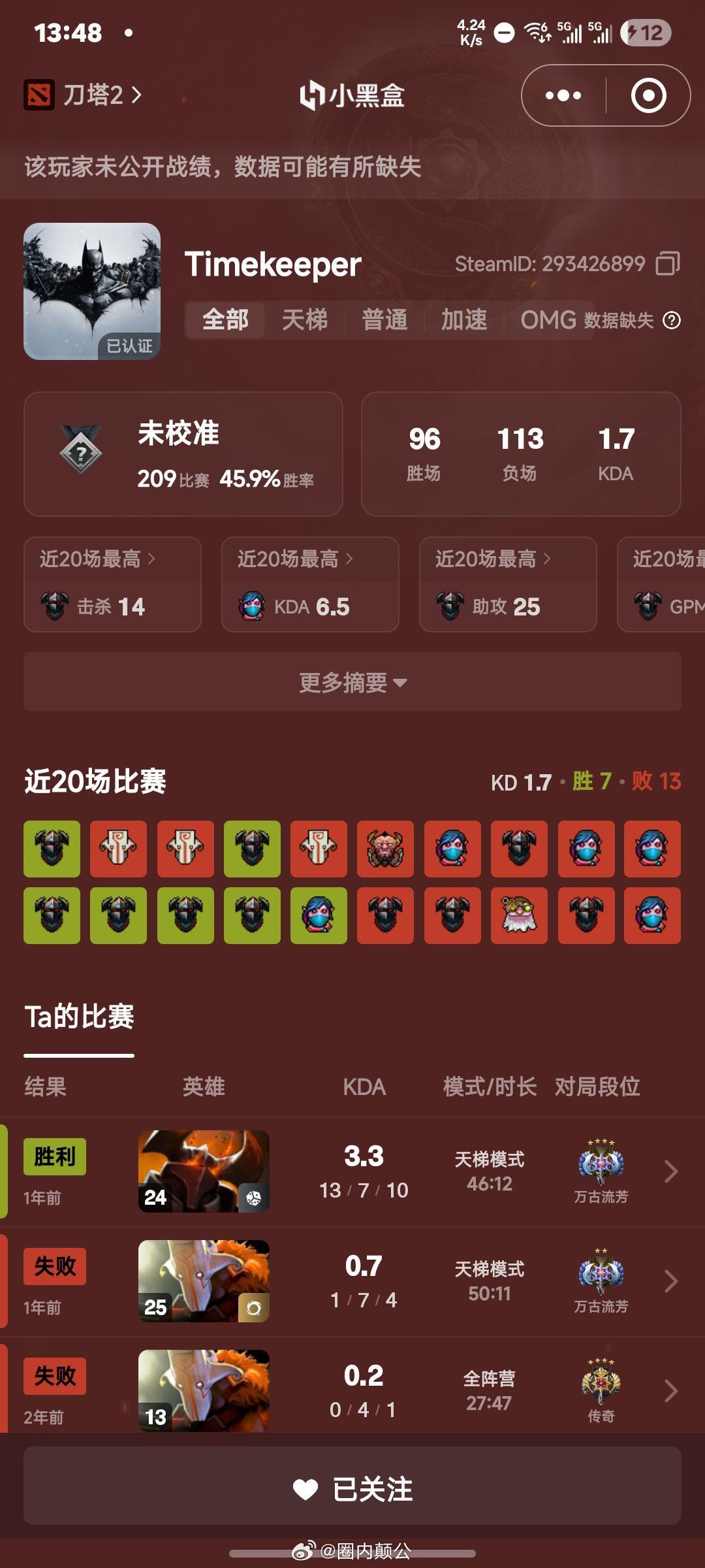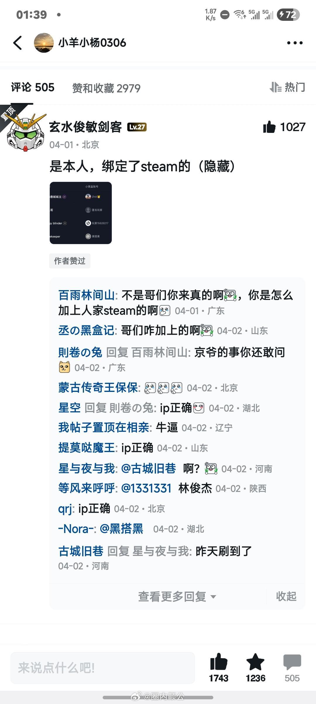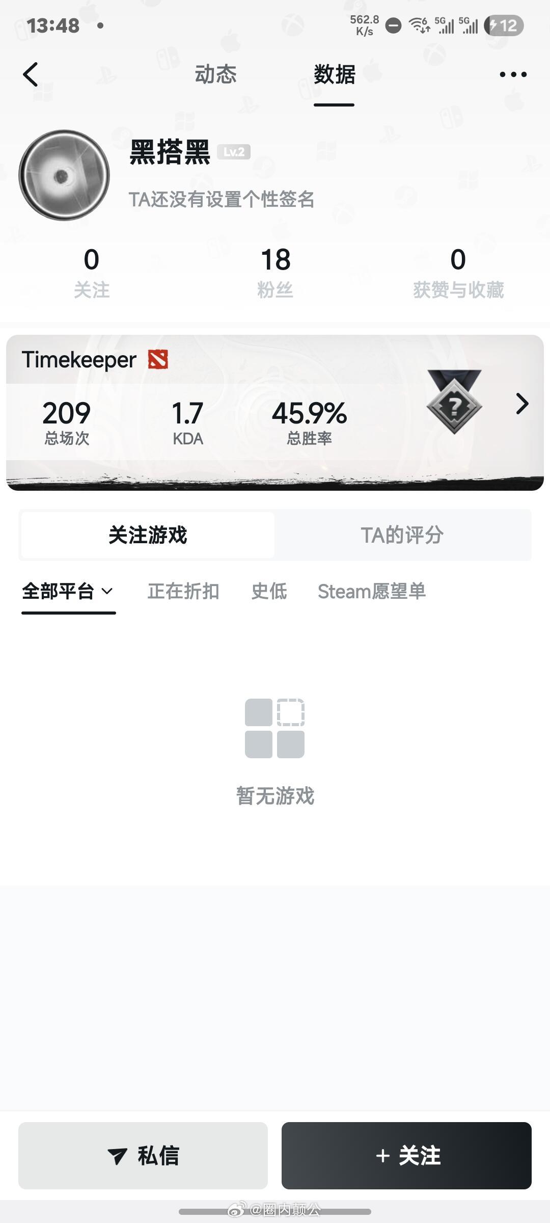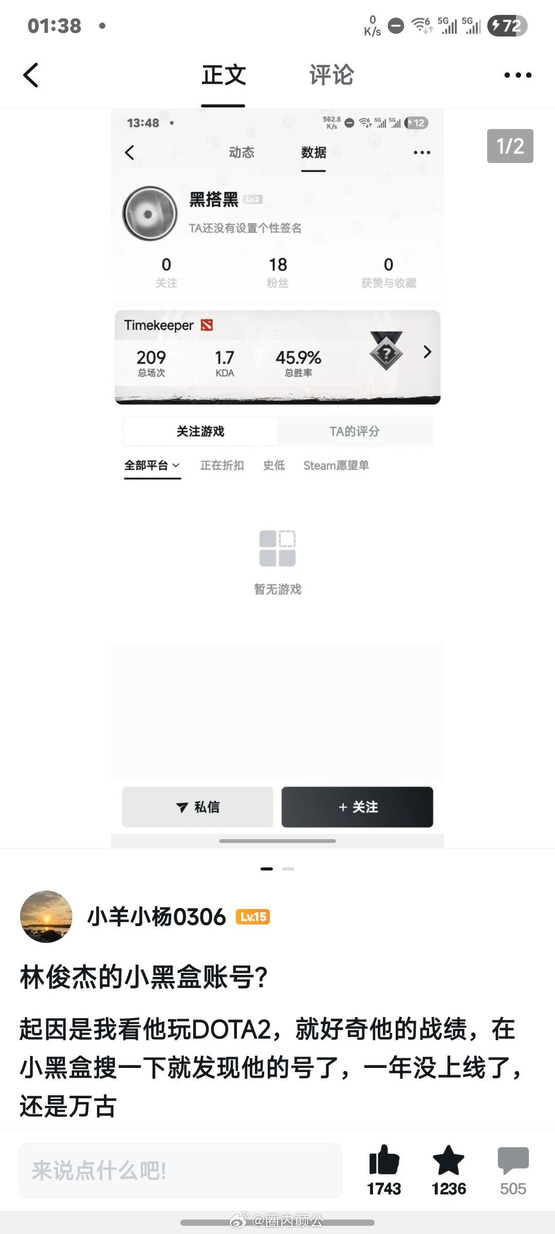 🍉林俊杰的游戏账号和小黑盒号被网友扒!有眼尖的网友顺藤摸瓜,找到了林俊杰的Steam游戏账号和小黑盒(一款游戏交流平台)的账号,并挖出了林俊杰的DOTA2战绩;据显示,林俊杰在小黑盒上的账号属于"未宣传式"注册,起初并没有很多人关注,但后续博主发帖致此小号被扒,此账号在一星期内粉丝量呈直线增长;网友:原来网瘾少年离我这么近