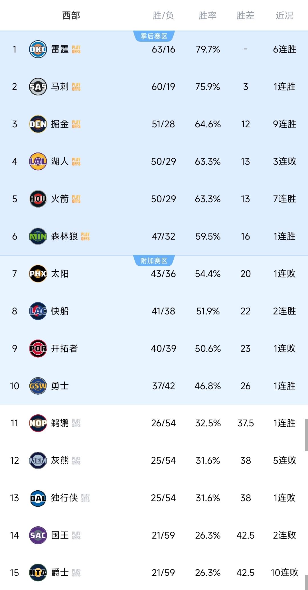西部排名又乱了! 火箭大逆转,战绩追平湖人! 西部前六全部确定,排名更新! 北京时间4月8日,NBA常规赛继续进行。 ①勇士110-105国王。 勇士凭借第二节轰下41分做好铺垫,本来已经建立较为稳固的优势,只是下半场状态起伏颇大,导致让悬念陡增,末节一度被反超,还好关键时刻队伍没掉链子,最后连续把握机会,有惊无险告捷,终结连败,库里替补贡献17分5板。 ②快船116-103独行侠。 独行侠0-17的天崩开局,全队状态调动尤为慢热,首发阵容仅靠着弗拉格支撑,虽说后程逐渐迎来反弹,甚至能实现反超,可惜没办法一鼓作气。快船失误控制较为差劲,当队伍遇到困难的时候,伦纳德挺身而出,30分钟投篮19中11高效得到34分,稳扎稳打是顺利收获胜利,同时稳固西部第八的位置。 ③湖人87-123雷霆。 东契奇和里夫斯缺席,詹姆斯同样因伤不打,湖人的战力直线下降,即使前程角色球员敢打敢拼,但欠缺持续性,很快就展露差距,他们完全无法匹配强度,又一场惨痛的失利,本赛季遭雷霆四杀。 ④火箭119-105太阳。 太阳开场势头极猛,能里能外,犀利的攻势一度建立超过20分的优势,但状态掉得很快,投篮持续下滑,领先渐渐变得几乎无存。火箭低开高走,逐渐找回应有的节奏,先发主力轮番站出来解决问题,最终一鼓作气实现21分大逆转。