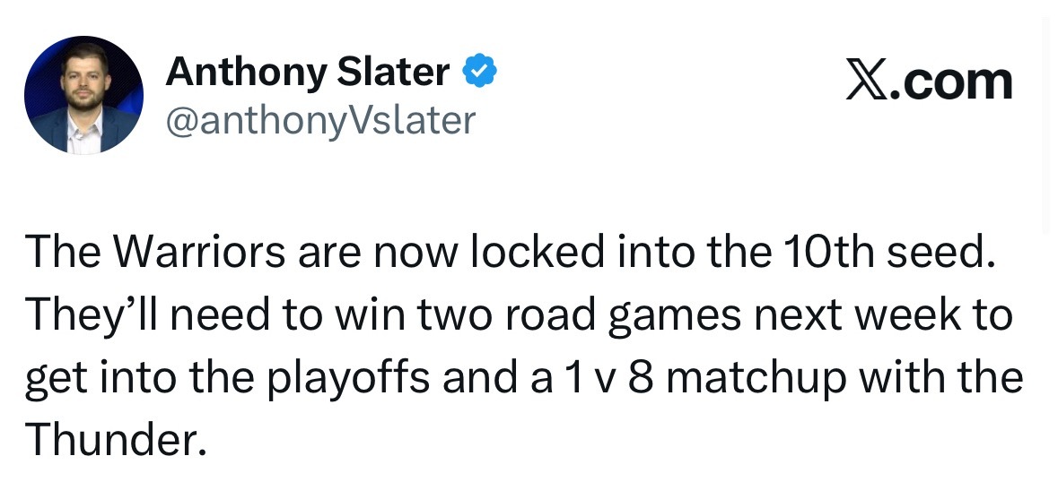 勇士队已锁定西部第10,他们需要在下周连赢两场客场附加赛,才能晋级季后赛,并在首轮对阵西部第一的雷霆队。