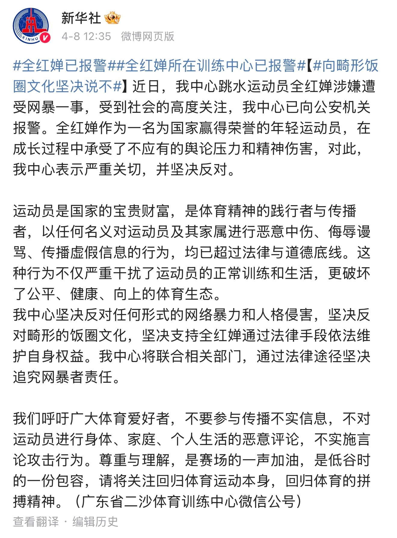 全红婵已报警 支持合理维权,坚决抵制网络暴力!全红婵19岁,奥运三金得主,却长期遭受有组织的网暴、恶意辱骂与造谣中伤,今天其所属训练中心发布声明,已就此事向公安机关报案,并将依法追究相关责任,坚决抵制畸形饭圈文化与网络暴力行为。