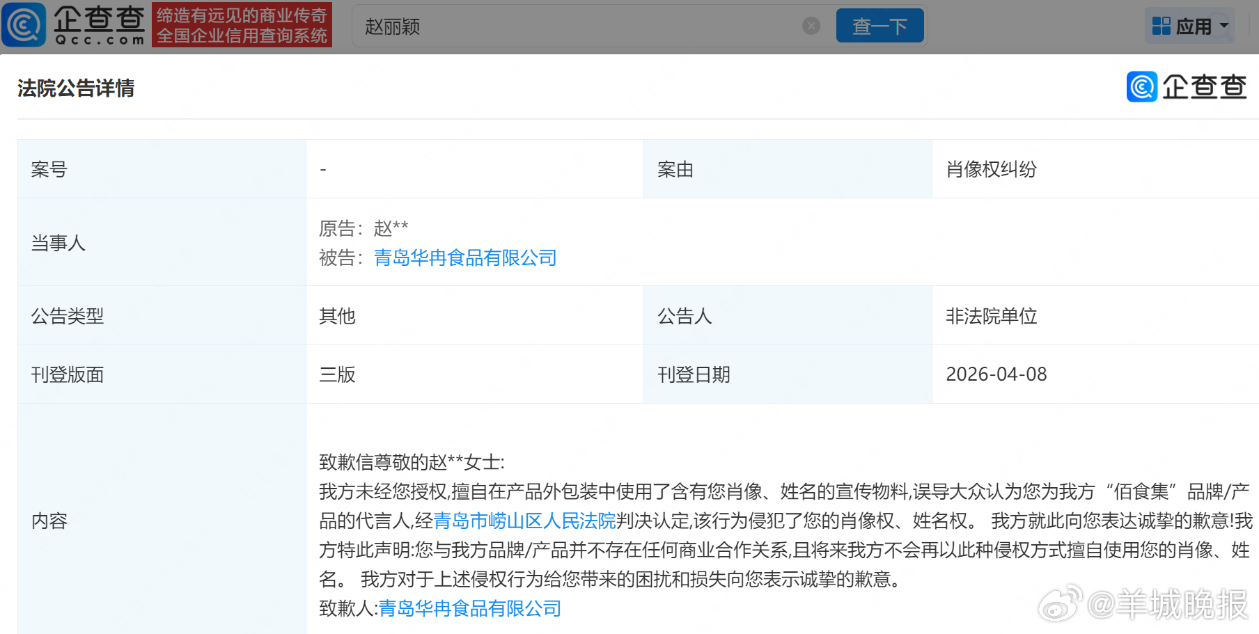 【#侵权赵丽颖方公开道歉#】#侵权赵丽颖商家登报致歉# 企查查APP显示,近日,法院刊登青岛华冉食品有限公司向的道歉声明。该公司未经授权,擅自将赵丽颖肖像及姓名用于产品外包装宣传,误导公众认为双方存在代言合作,已被法院认定构成侵权。涉事公司现已公开致歉,并承诺今后不再擅自使用其肖像与姓名。更多消息:#金子涵 再逼我就把所有的都说出来##刘思维当爸爸了##江语晨小考突然离场##徐艺洋回应黄子韬身体状况##浪姐小考 完全小品##小S讲述大S走之后好友贾永婕的鼓励#(编辑:杨雨桐;审签:周乐瑞)
